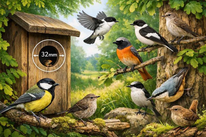 Tento průměr otvoru poskytuje ptákům dostatek prostoru pro pohodlný vstup, zároveň však omezuje přístup větších druhů a predátorů.