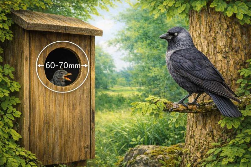 Ptačí budky s vletovým otvorem o průměru 60 až 70 mm jsou určeny především pro kavku obecnou, která patří mezi větší dutinové ptáky a ke vstupu do hnízda potřebuje prostornější otvor.