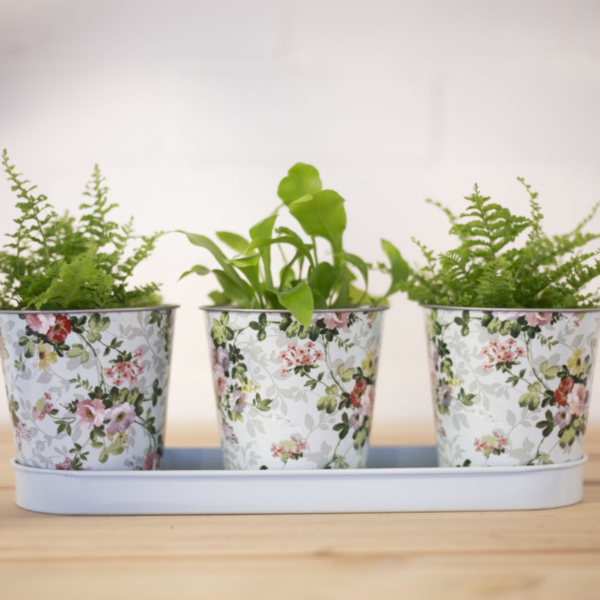 Zinkové kruhové květináče (3 kusy) s podmiskou, v pistáciově zeleném barevném provedení s potiskem divokých růží a šeříku.