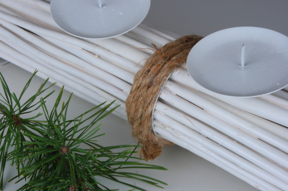 Bílý ratanový adventní svícen pro čtyři svíčky dekorovaný jutovým provázkem. Adventní svícen je nezbytnou součástí předvánočního období. Zapalte si každou adventní neděli jednu svíčku na tomto neokoukaném svícnu.