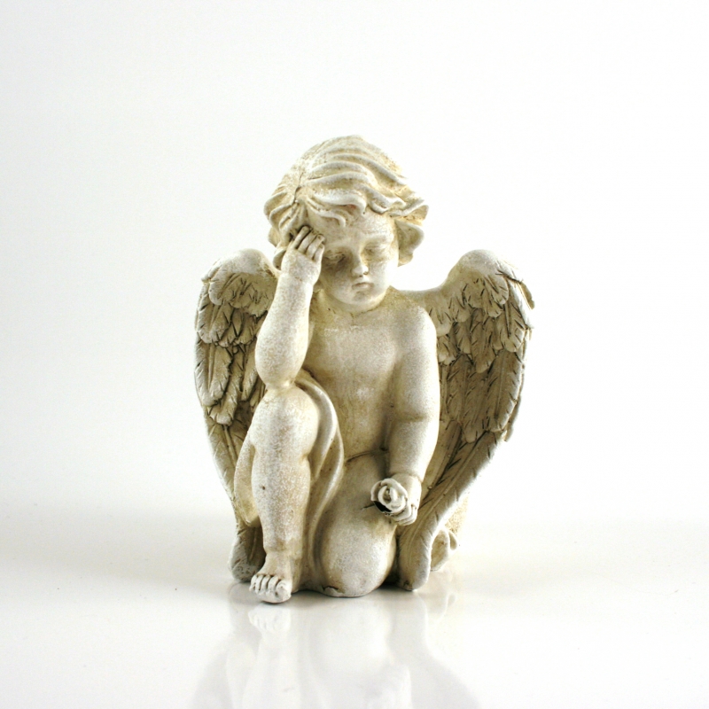 Anděl na obrázku nese na svých zádech neobvyklou zátěž, je to květináč o průměru