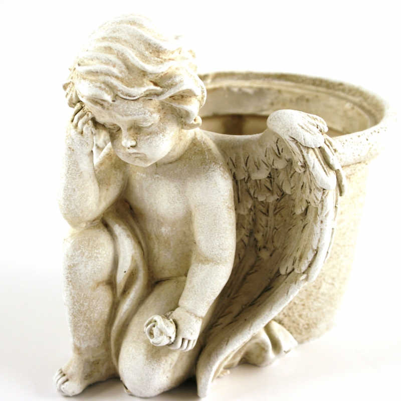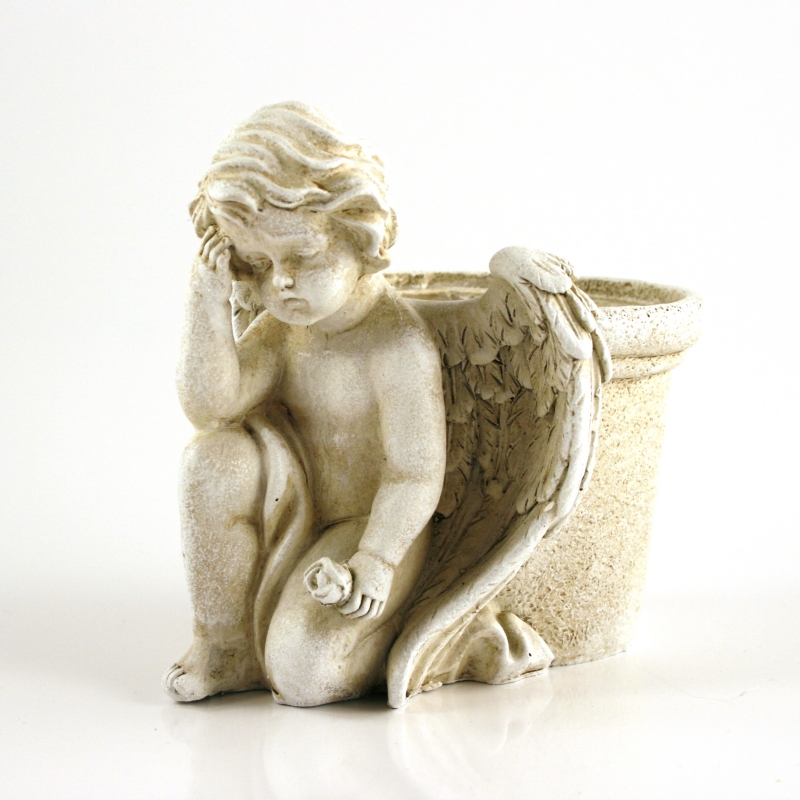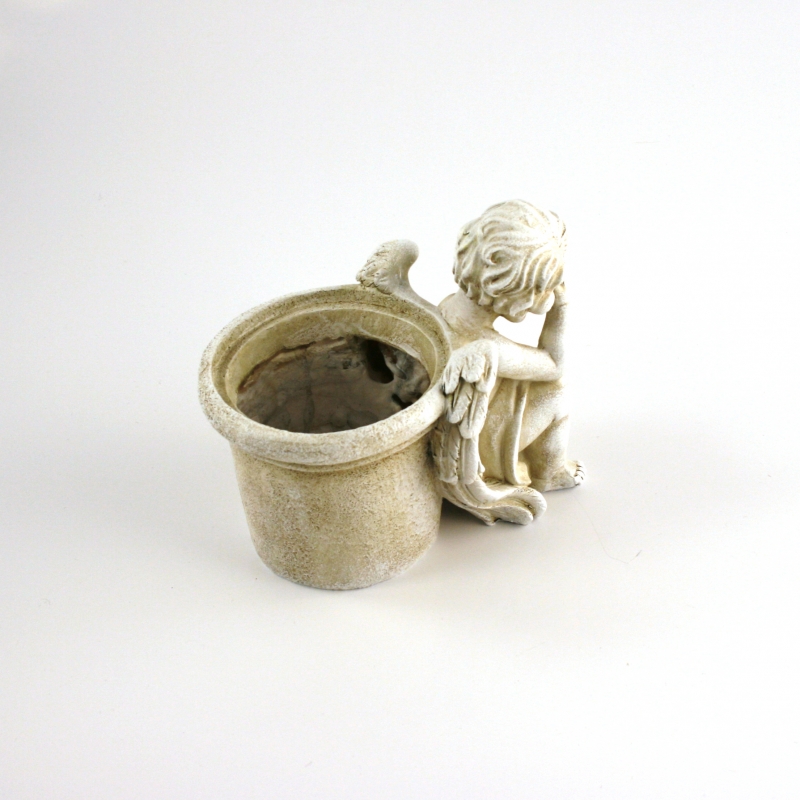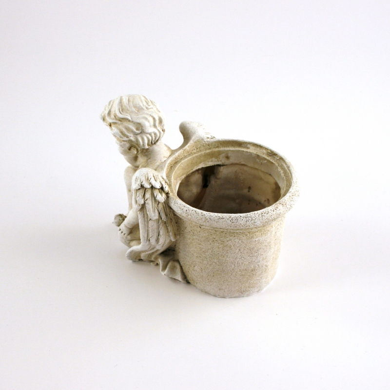 Anděl je vysoký 16 cm a on i květináč na jeho šíji jsou ve světlé barvě.