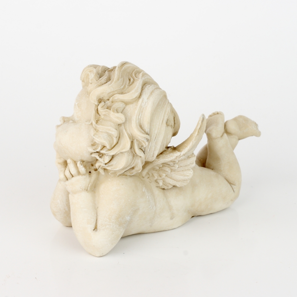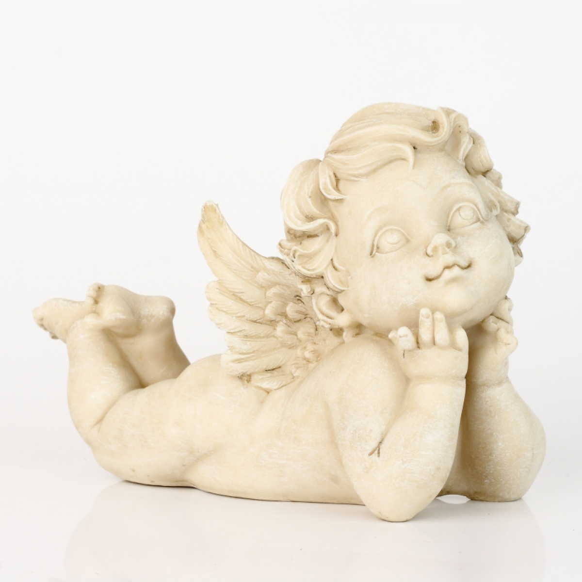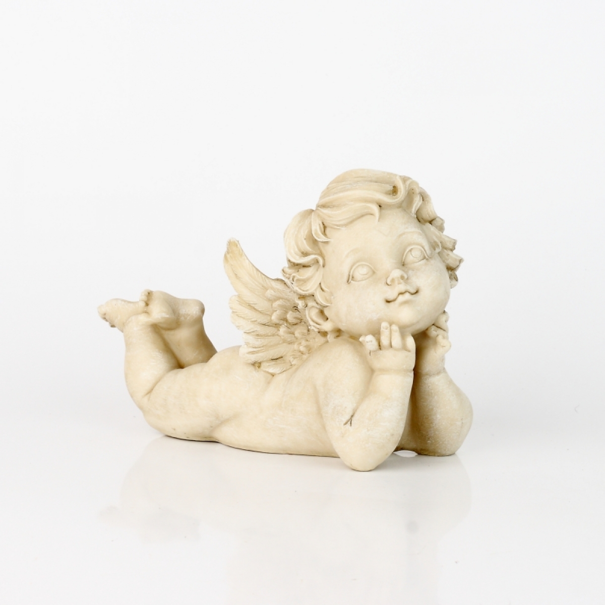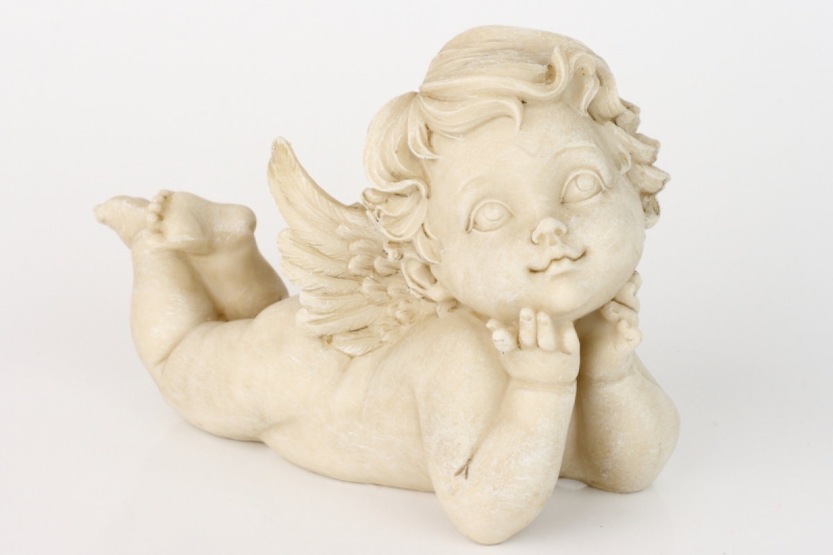 Malý ležící anděl s křidélky a rukami složenými pod bradou.