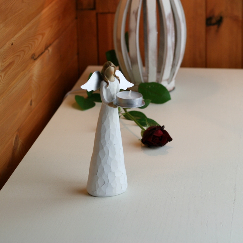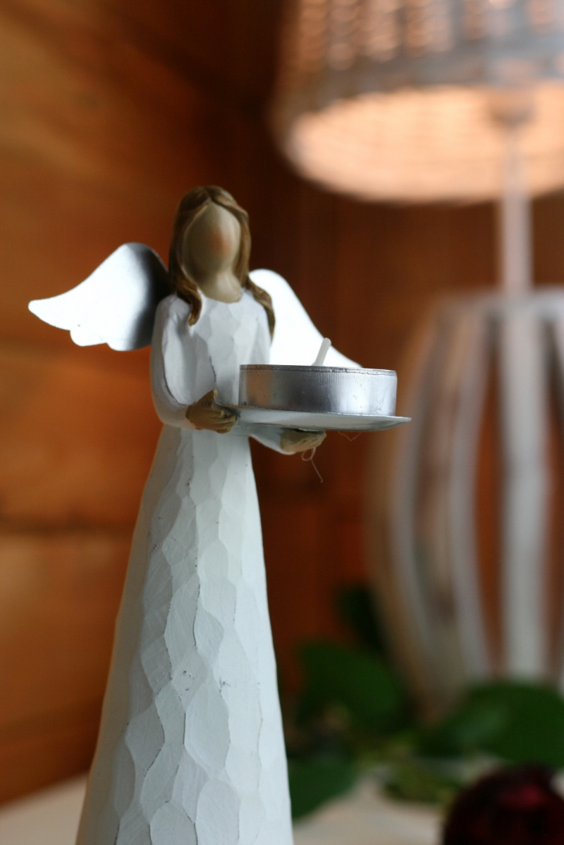 Anděl drží na rukou tácek, který slouží jako táce na čajovou svíčku. Je to tedy jakýsi andělský svícen.