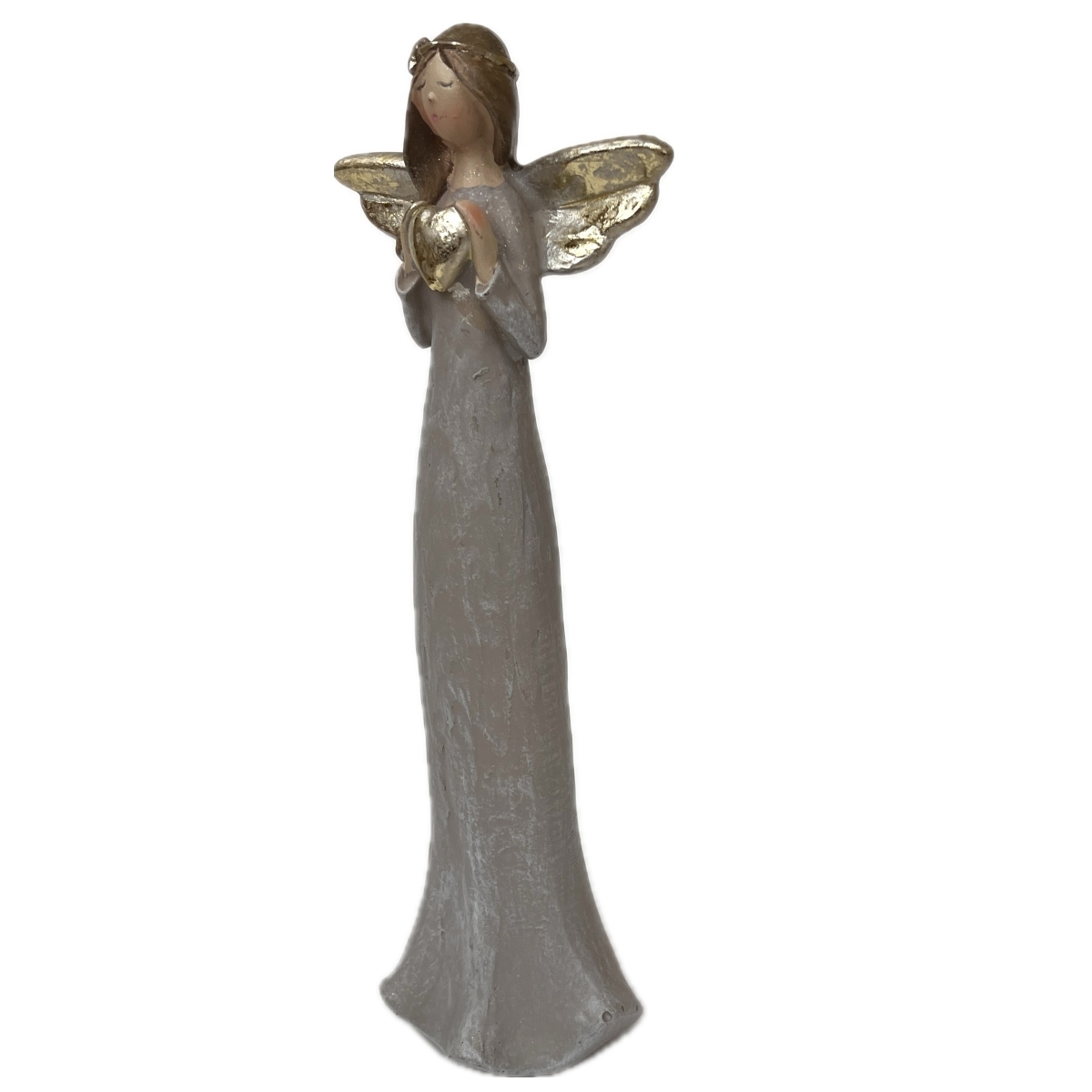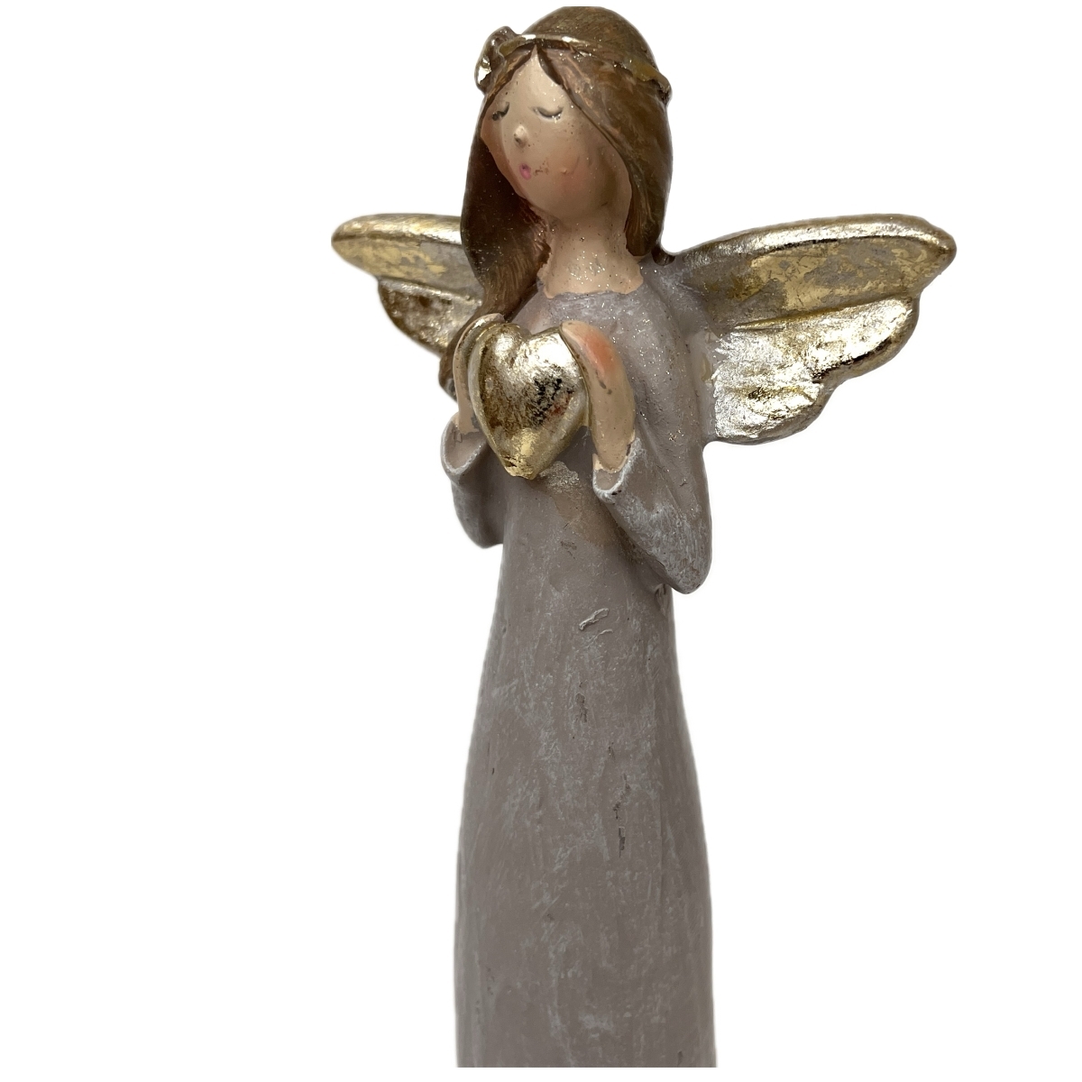 Dokonale zpracované detaily – tvář plná jemnosti, ruce objímající srdce, křídla jemně modelovaná – působí jako tichá modlitba.