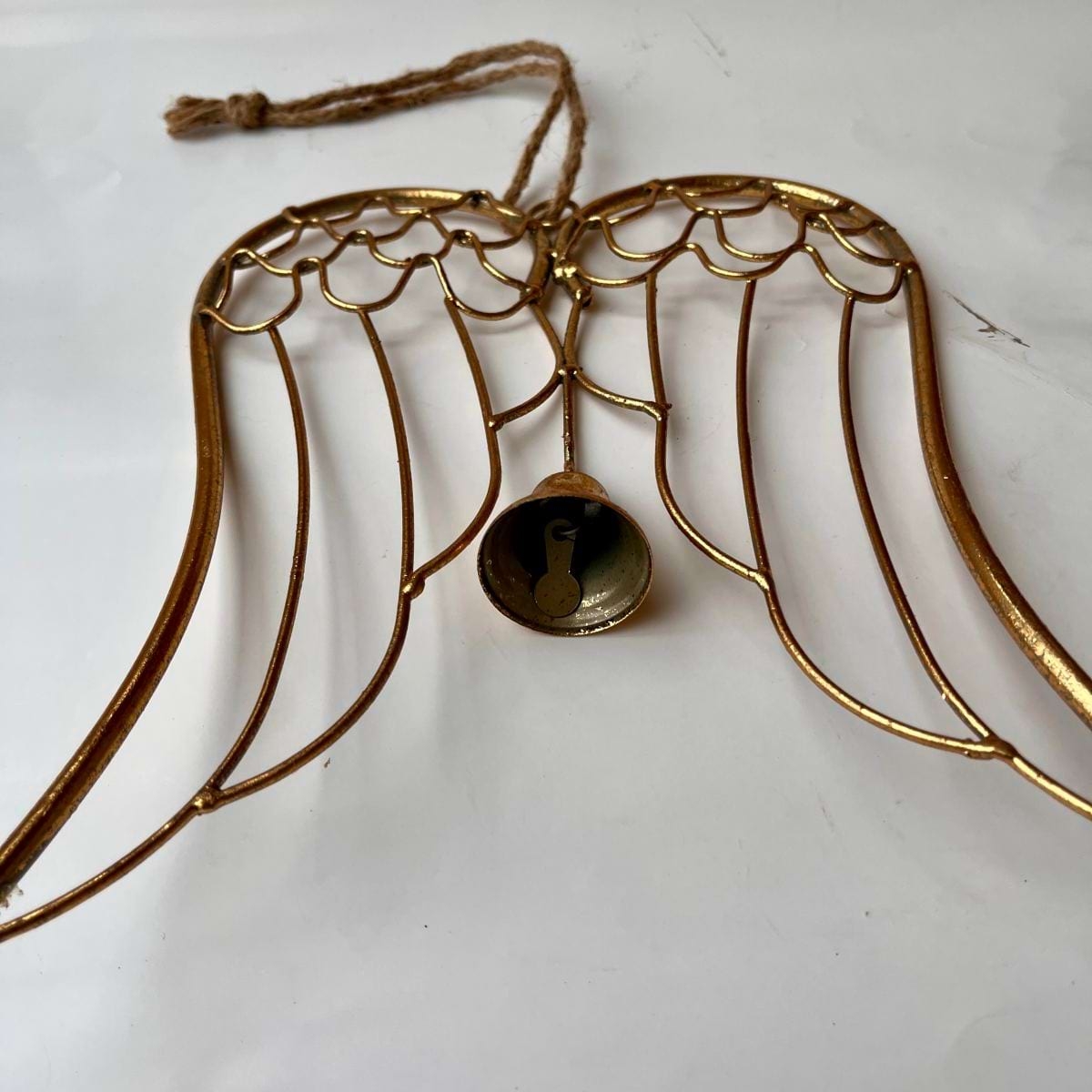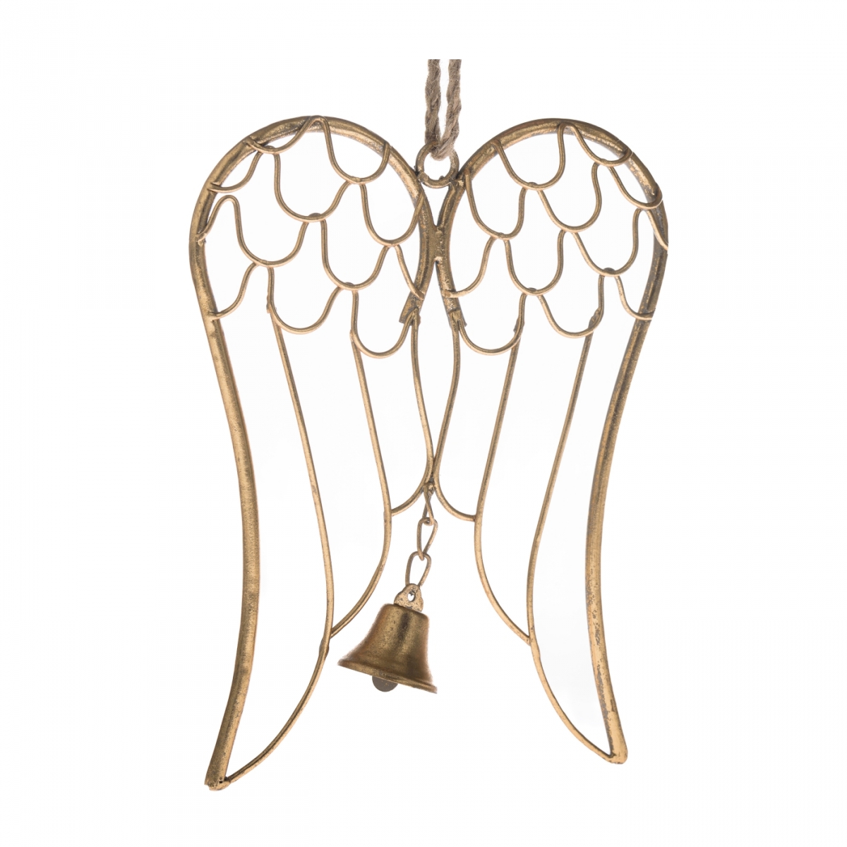 Andělská křídla Auriel — kovová vánoční dekorace se zvonečkem (23 × 18,5 × 1,5 cm)