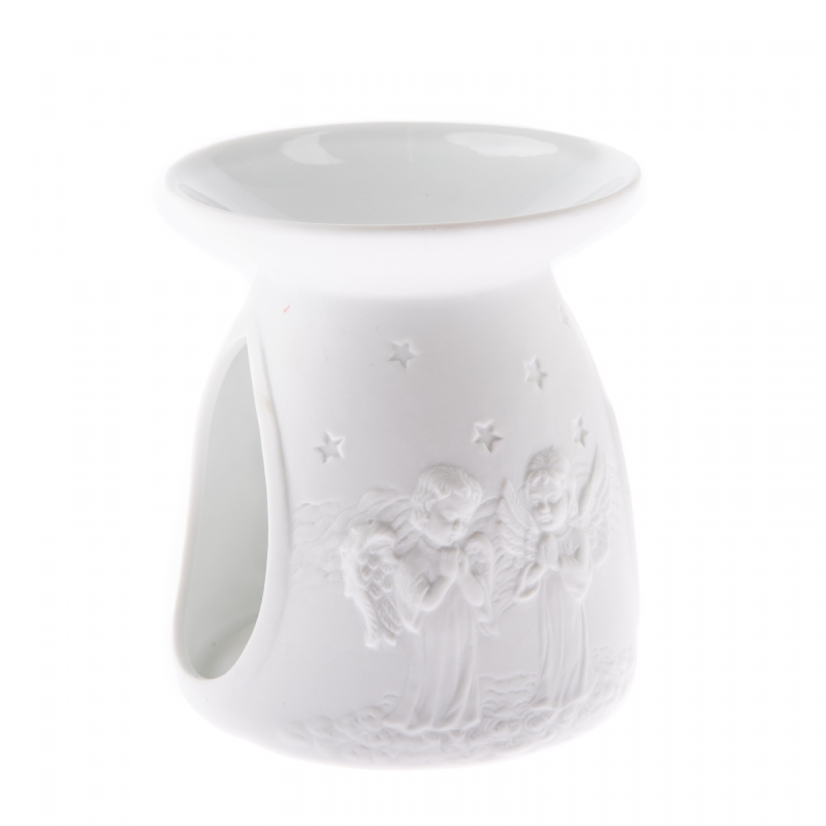Aroma lampa z bílé keramiky s motivem andělů je určená pro odpařování éterických olejů, vonných esencí a vosků. Do spodní části aromalampy stačí umístit a zapálit čajovou svíčku a do nádobky nad ní nalít vodu, do které nakapete pár kapek vonné esence nebo vlivem tepla necháte rozpustit vonný vosk.