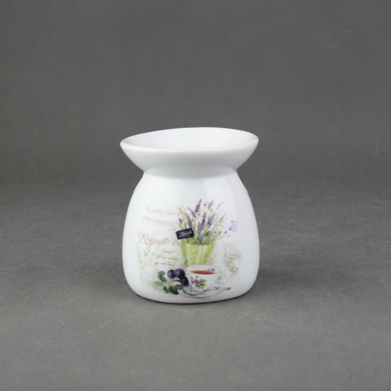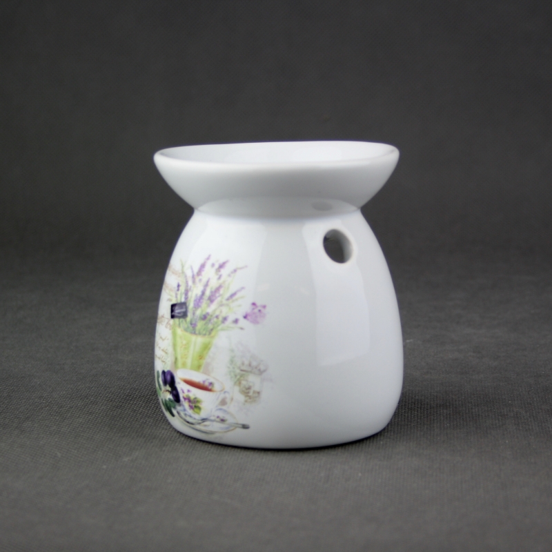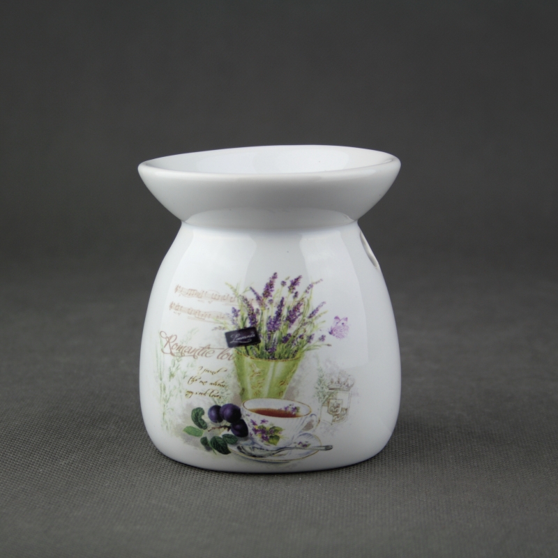 Aroma lampa s romantickým motivem levandule a šálkem čaje.