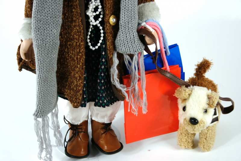 Součástí její garderóby je i elegantní klobouk. Kromě zelených šatů a hnědého kožíšku má babička také šedou šálu a nechybí jí ani korále kolem krku. Psík na vodítku je menšího vzrůstu a bílo-hnědé barvy.