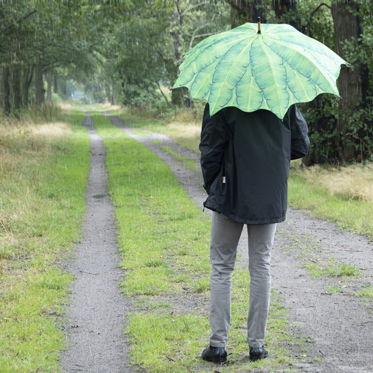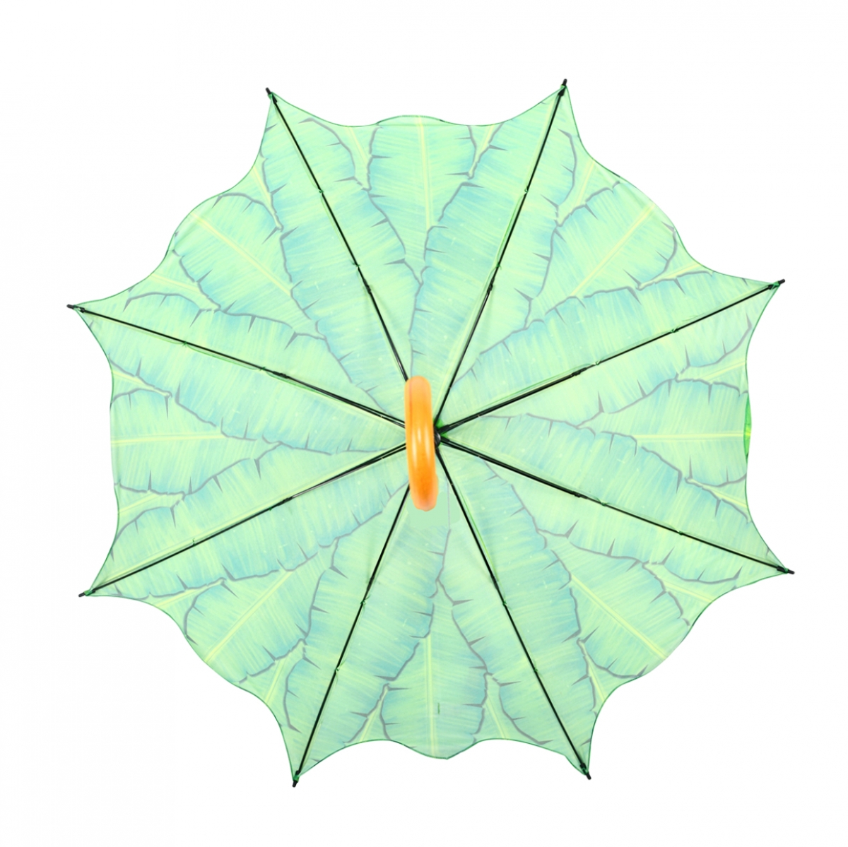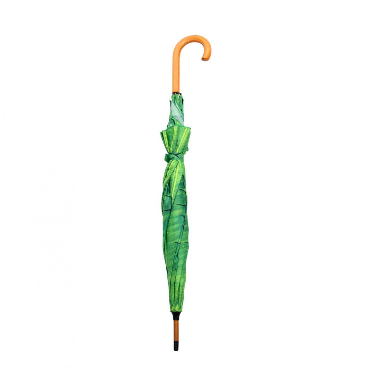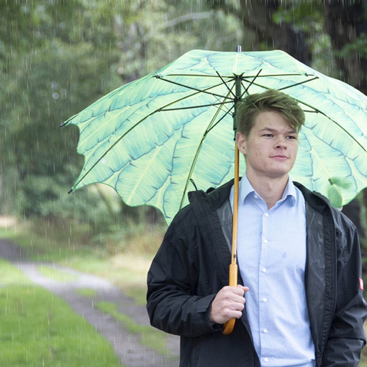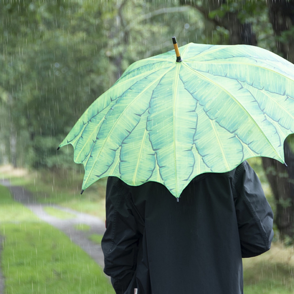 Barevný deštník s motivem banánového listu svojí velikostí bezpečně v suchu ukryje i velkého dospělého muže.