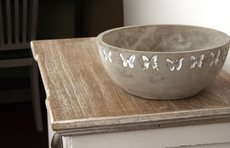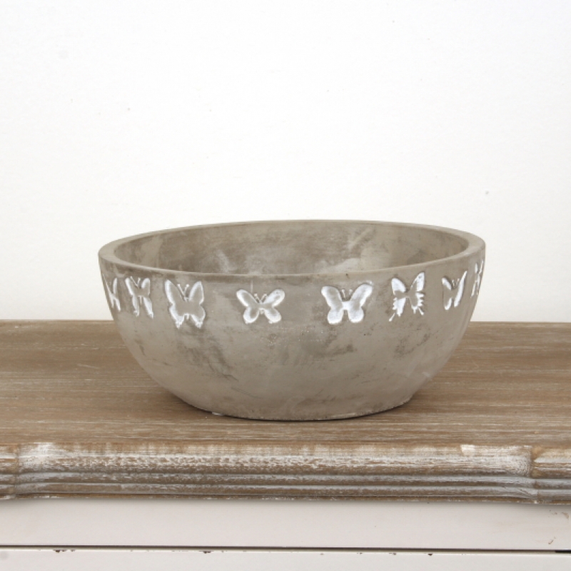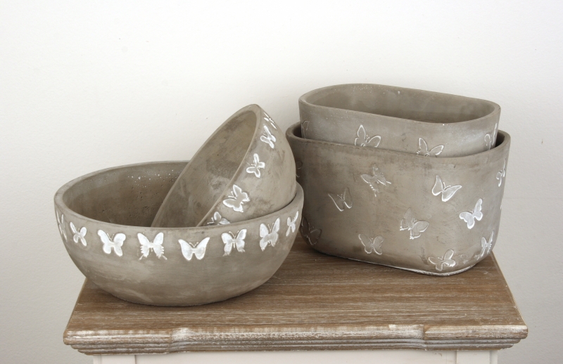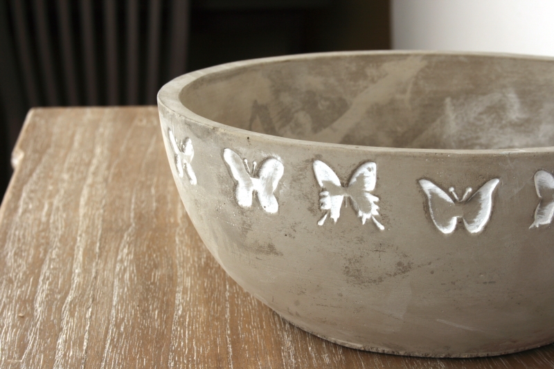 Květináč má tvar velké mísy. Povrch s lehkou patinou má surový vzhled, který zjemňuje použitý motiv motýlů.