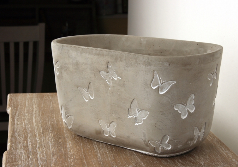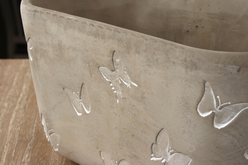 Květináč má tvar velké mísy. Povrch s lehkou patinou má surový vzhled, který zjemňuje použitý motiv motýlů.
