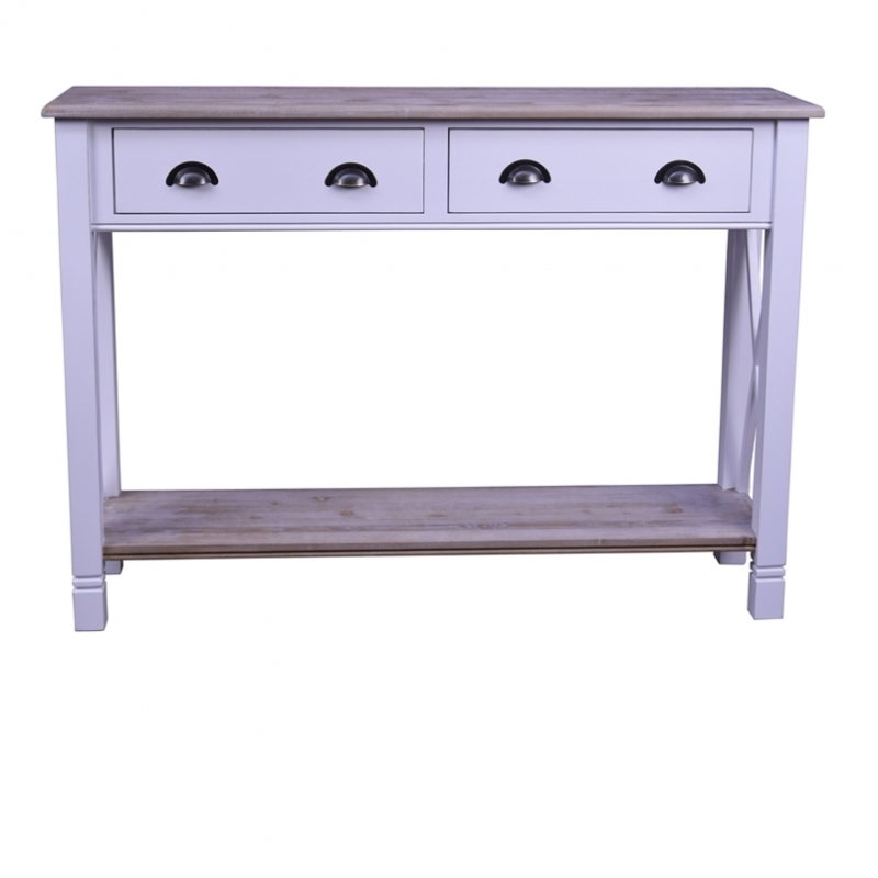 Bílý venkovský konzolový stolek 135x95x40cm se dvěma šuplíky s oblíbenými úchytkami ve tvaru kapes. Konzolový stůl má horní desku a polici v přírodních tónech dřeva, které tak spoledčně s bílým stolem tvoří dokonalý pár. Boky stolu jsou vyplněny malými trámy do tvaru kříže.