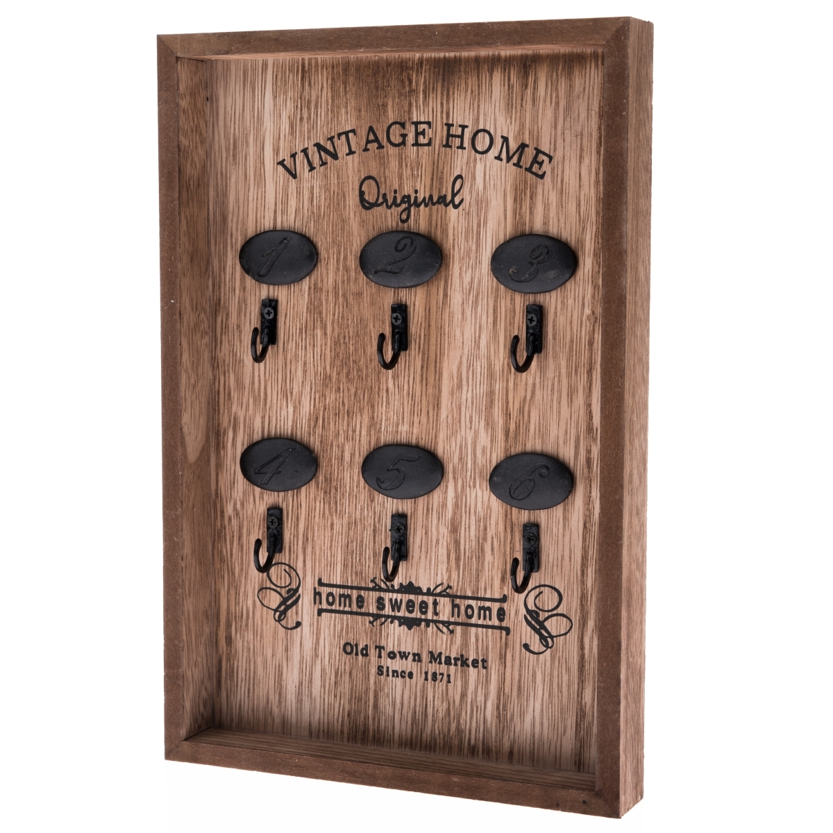 Box na klíče ve vintage stylu je vyrobený ze dřeva a je vybavený šesti kovovými háčky pro zavěšení klíčů.