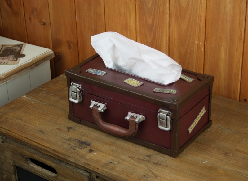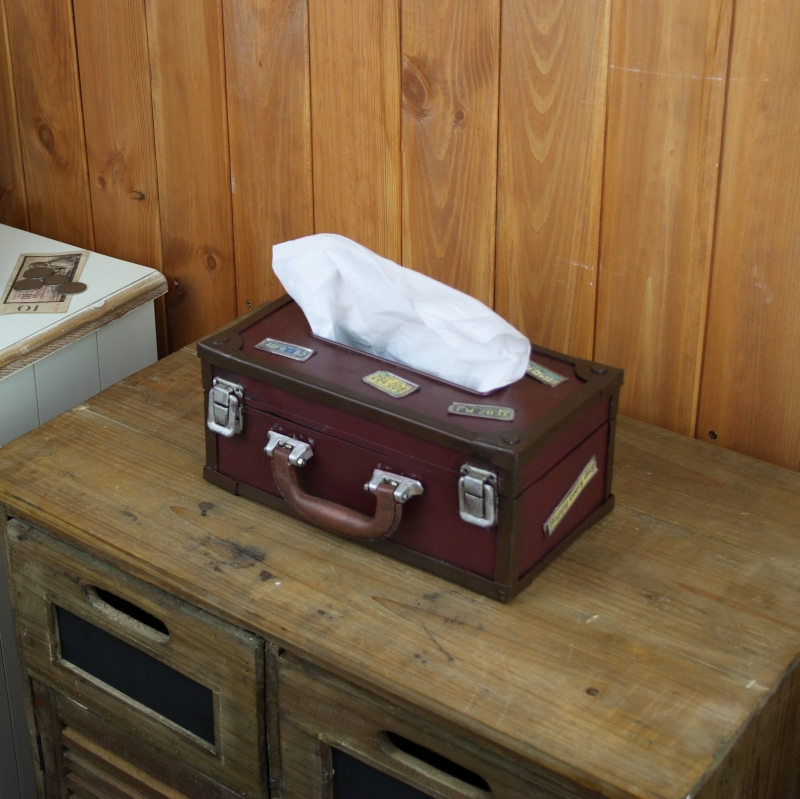 Nádherný plechový box na ubrousky ve tvaru kufříku. Ubrousky je potřeba mít vždy po ruce - je to běžná kosmetická pomůcka, která se však vyrábí v obyčejném papírovém obalu s mnohdy nevkusnými motivy.