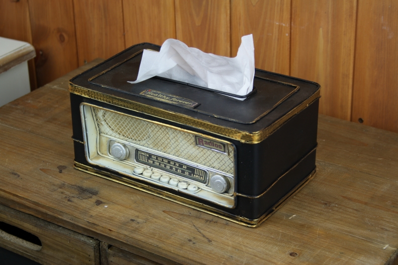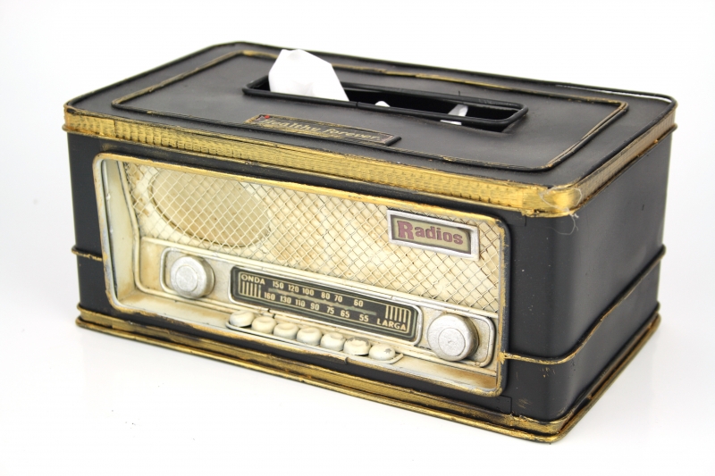 Nádherný plechový box na ubrousky ve tvaru rádia. Ubrousky je potřeba mít vždy po ruce - je to běžná kosmetická pomůcka, která se však vyrábí v obyčejném papírovém obalu s mnohdy nevkusnými motivy.