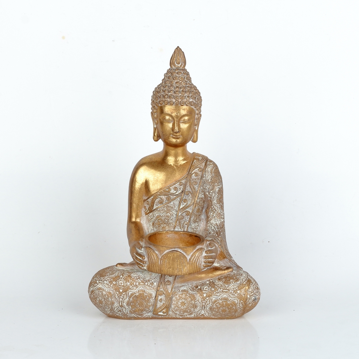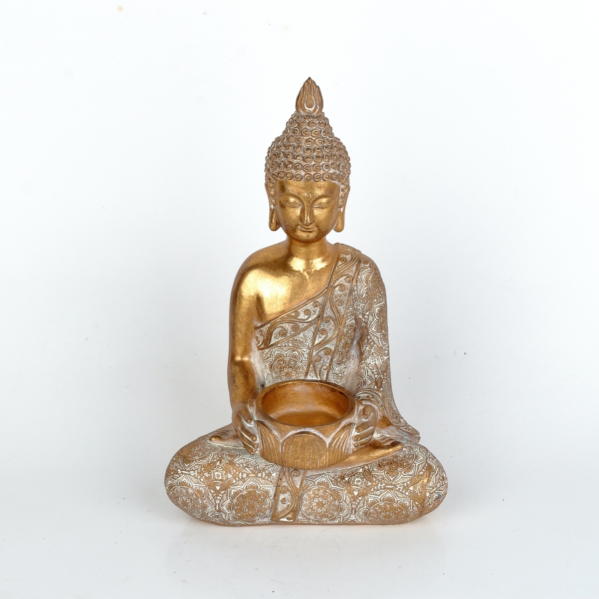 Buddha jako svícen na čajovou svíčku v nádherném zlatém provedení s patinou přichází na řadu ve chvíli, kdy slunce zajde za horizont a vy potřebujete po náročném dni načerpat energii posezením na zahradě, ve vaší oáze klidu a pohody.
