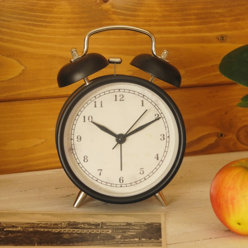 Budík s černým obalem je opatřen arabskými číslicemi i sekundovou ručičkou.