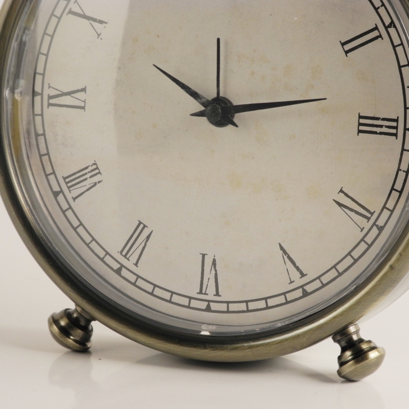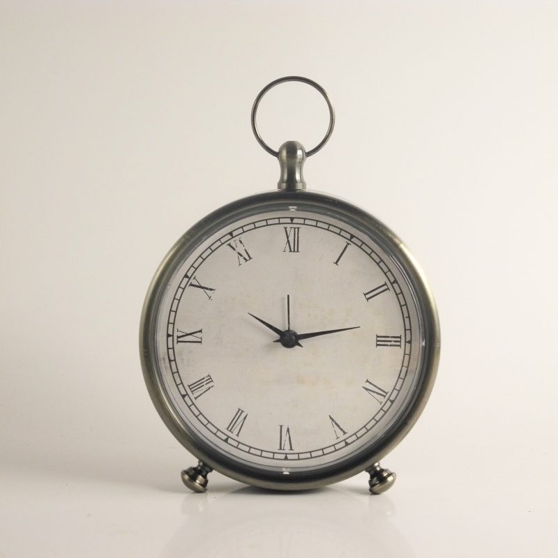Budík s jemnými římskými číslicemi a naznačením minut má průměr 15 cm, jeho celková výška je 24 cm. Hloubka těchto hodin se stříbřitým plechovým obalem je 4 cm.