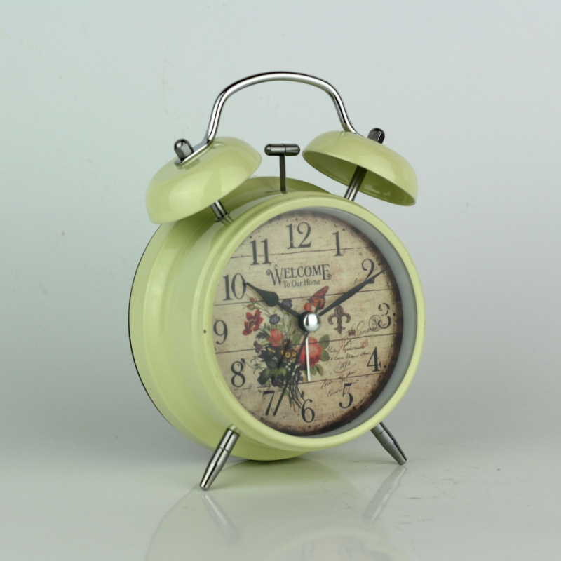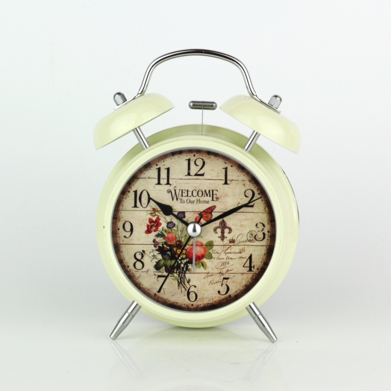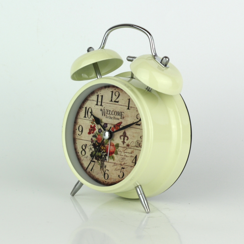 Budík Welcome to our home 17cm v decentní krémové barvě, ciferníkem s oprýskaným pozadím a motivem lučních květů.