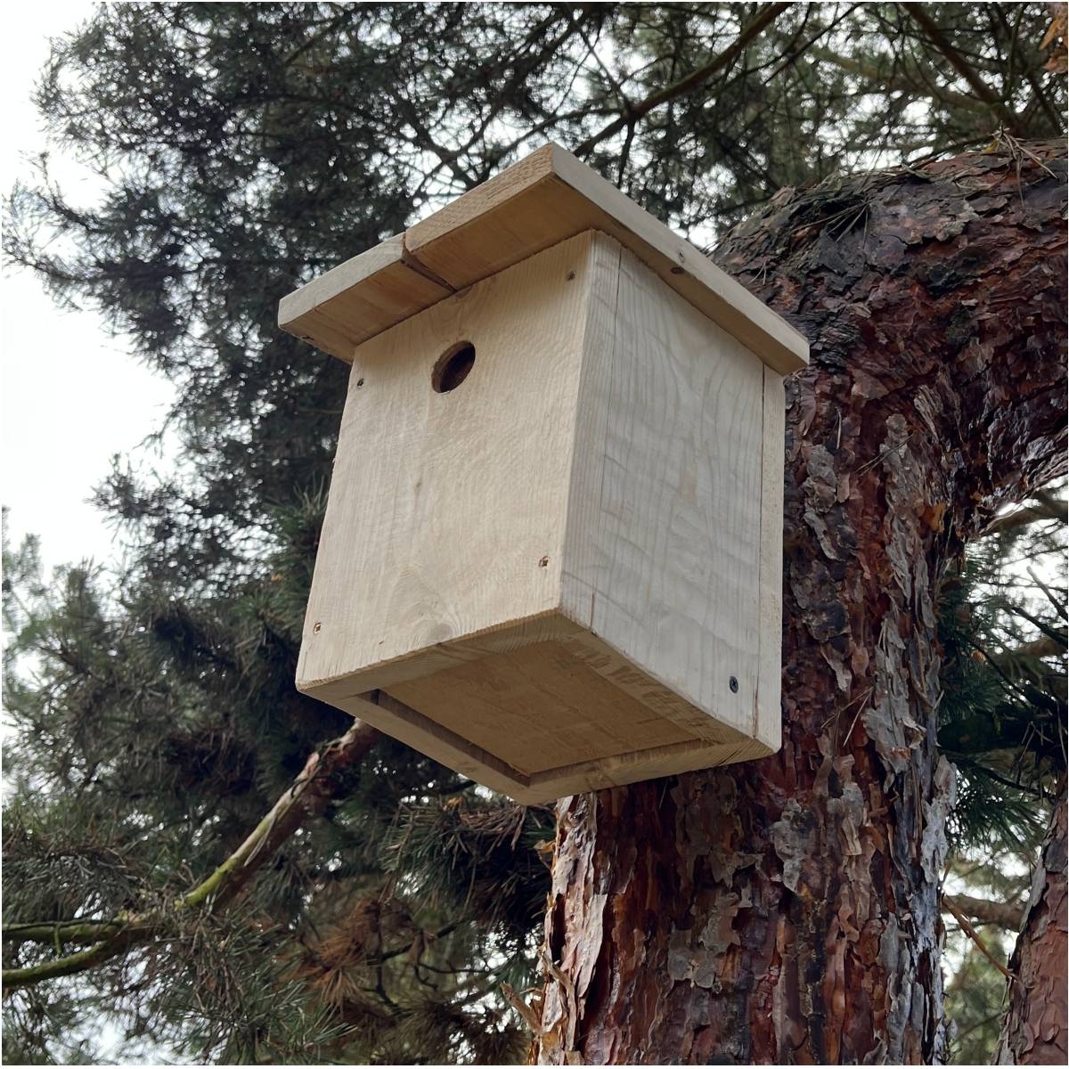 Búdka pre koňadry bez náteru ponecháva drevu jeho natur vzhľad a vytvára pokojné miesto, kam sa môžu sýkorky veľké vracať, hniezdiť a zostať nablízku.