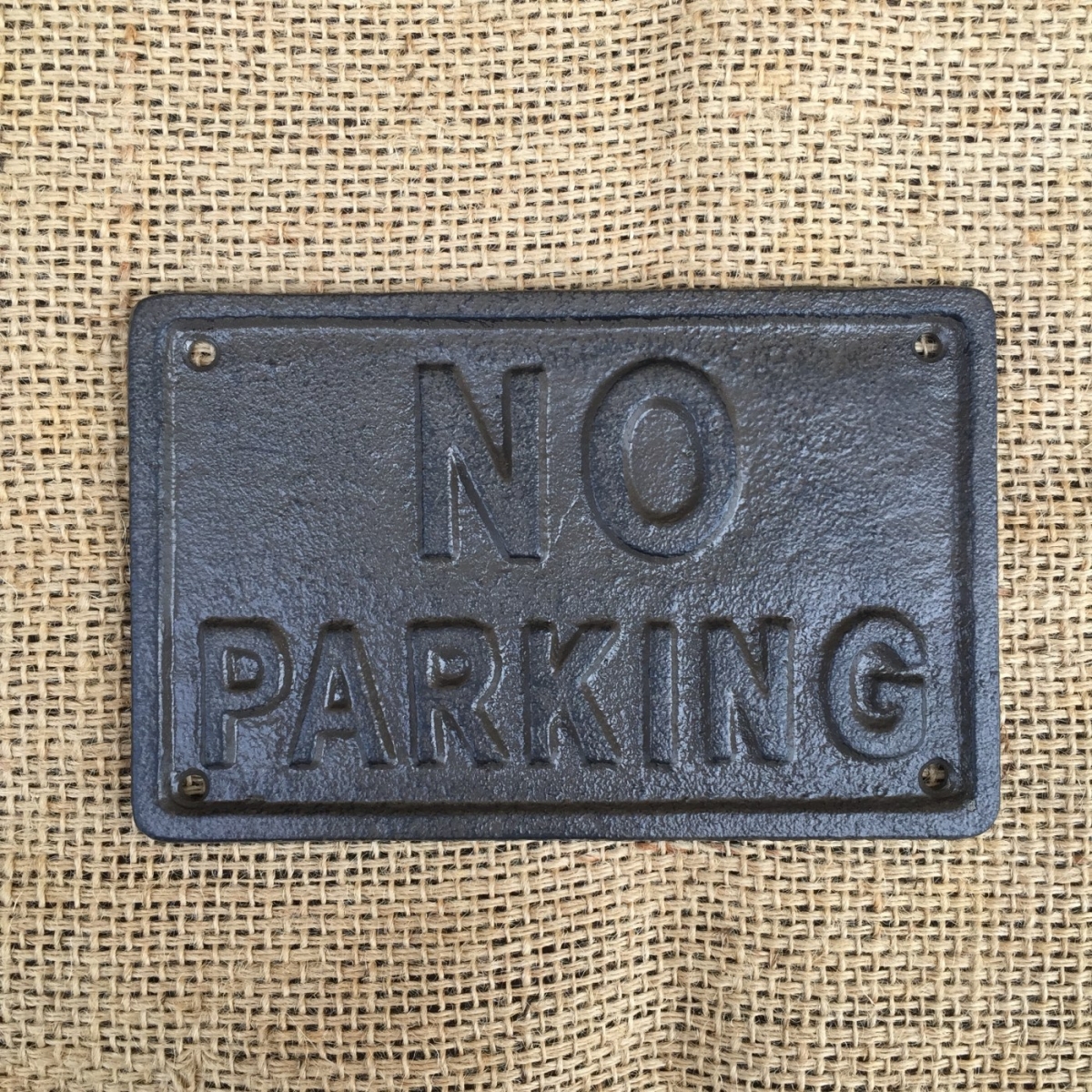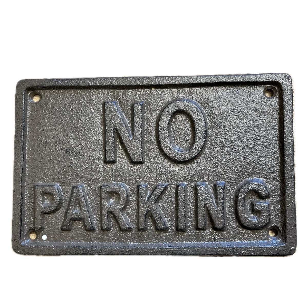 Cedule s nápisem NO PARKING je vyrobená z kvalitní litiny a opatřená čtyřmi otvory pro upevnění.