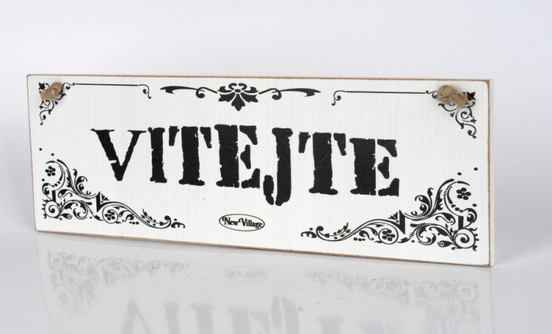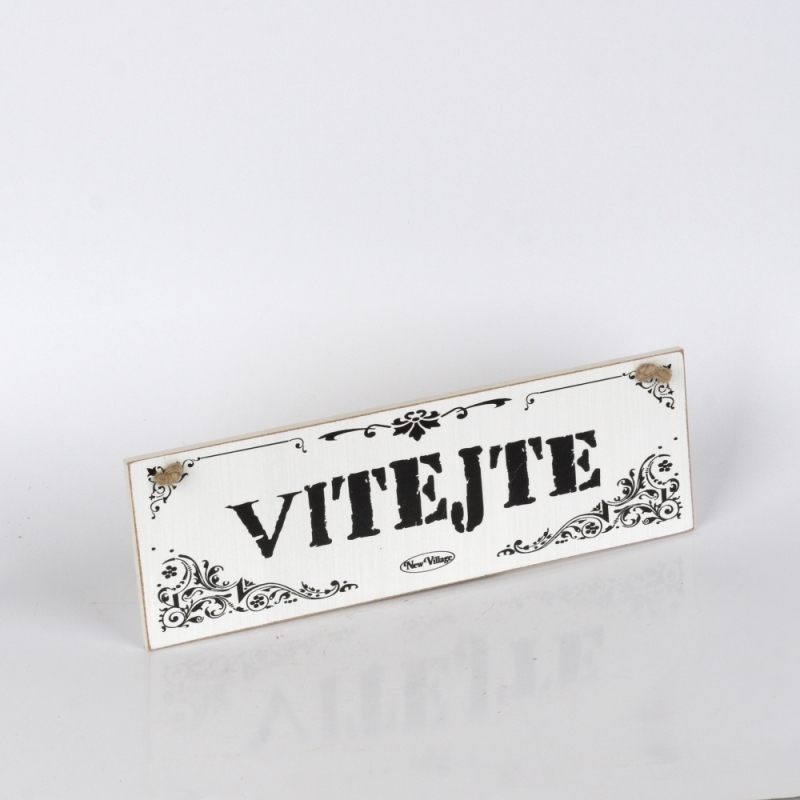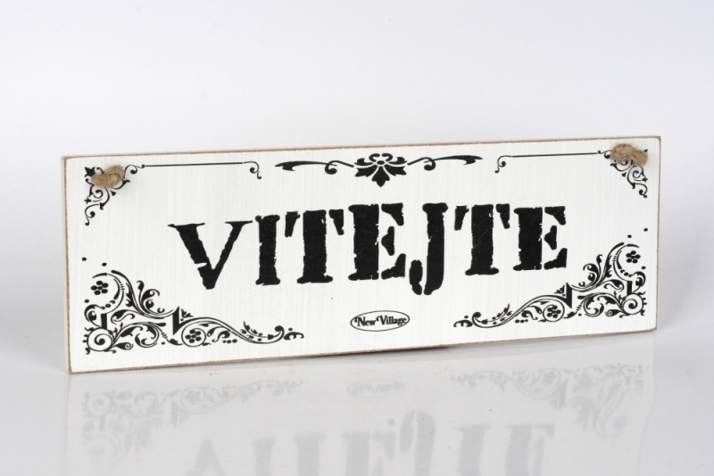 Cedule beze slov osloví všechny příchozí návštěvníky. Bílá dřevěná cedule je zdobená černými ornamenty a nápisem VÍTEJTE. Jednoduše ji zavěsíte díky jutovému provázku.