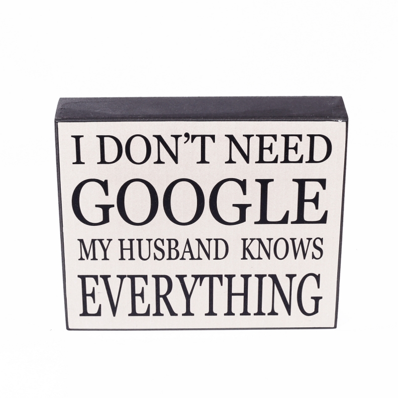 Nápis I DON´T NEED GOOGLE, MY HUSBAND KNOWS EVERYTHING možná není potřeba ani překládat (Nepotřebuji Google, můj manžel ví všechno).
