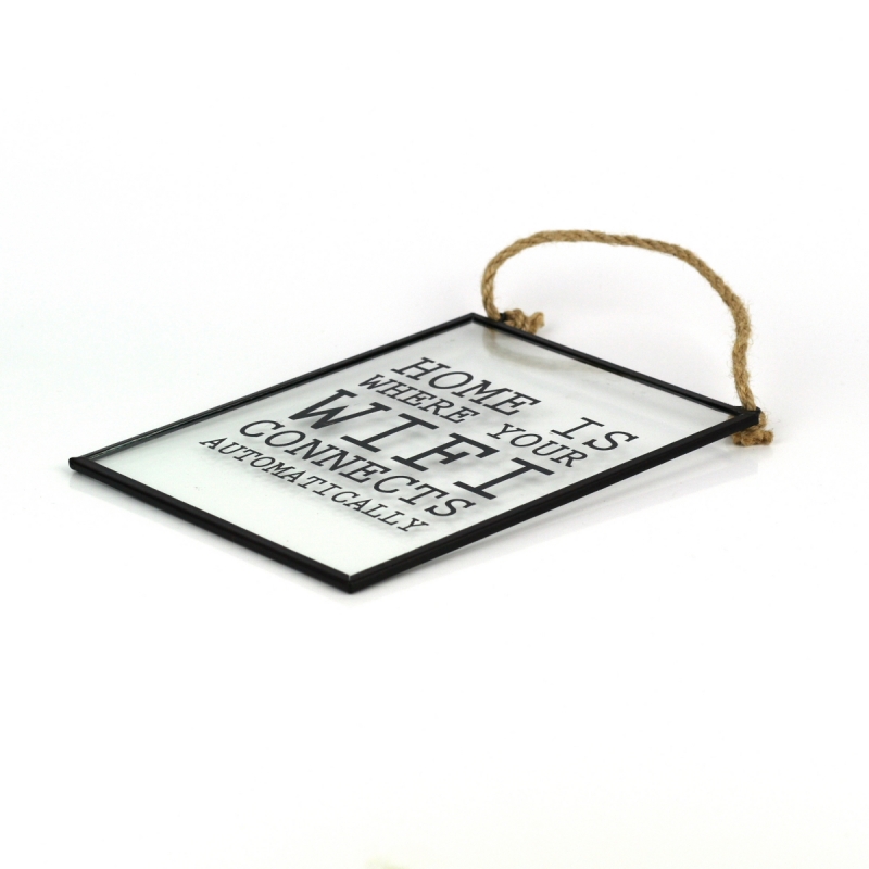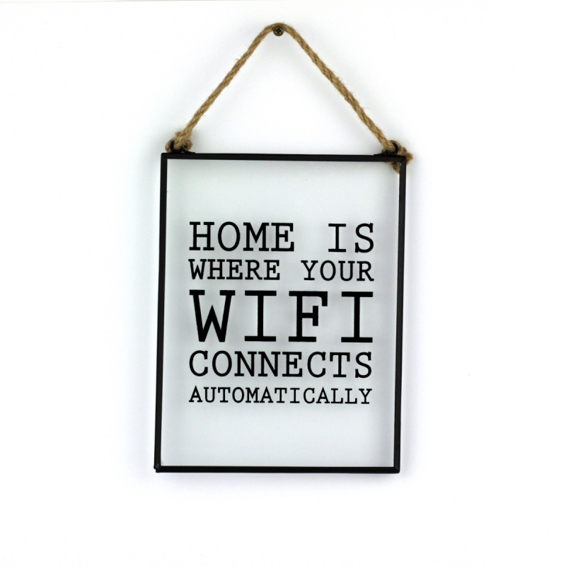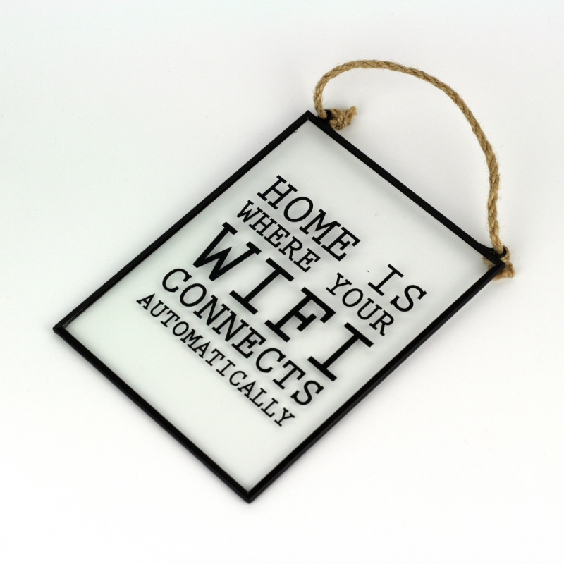 Vtipná skleněná cedule s nápisem Home is where your wifi connects automatically prozradí o majiteli téměř vše. Bez wifi prostě ani ránu.