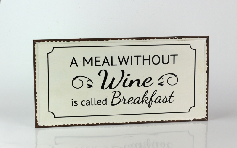 Plechová cedule s textem "Jídlo bez vína se nazývá snídaně".