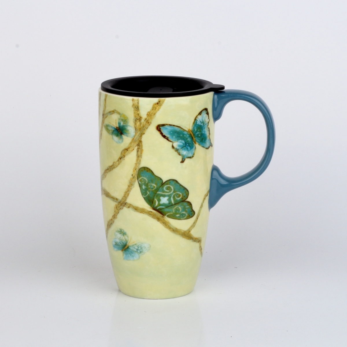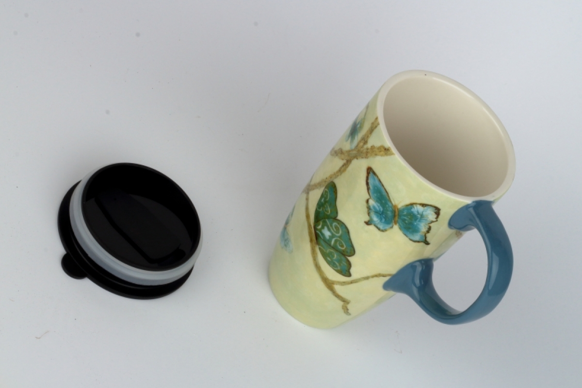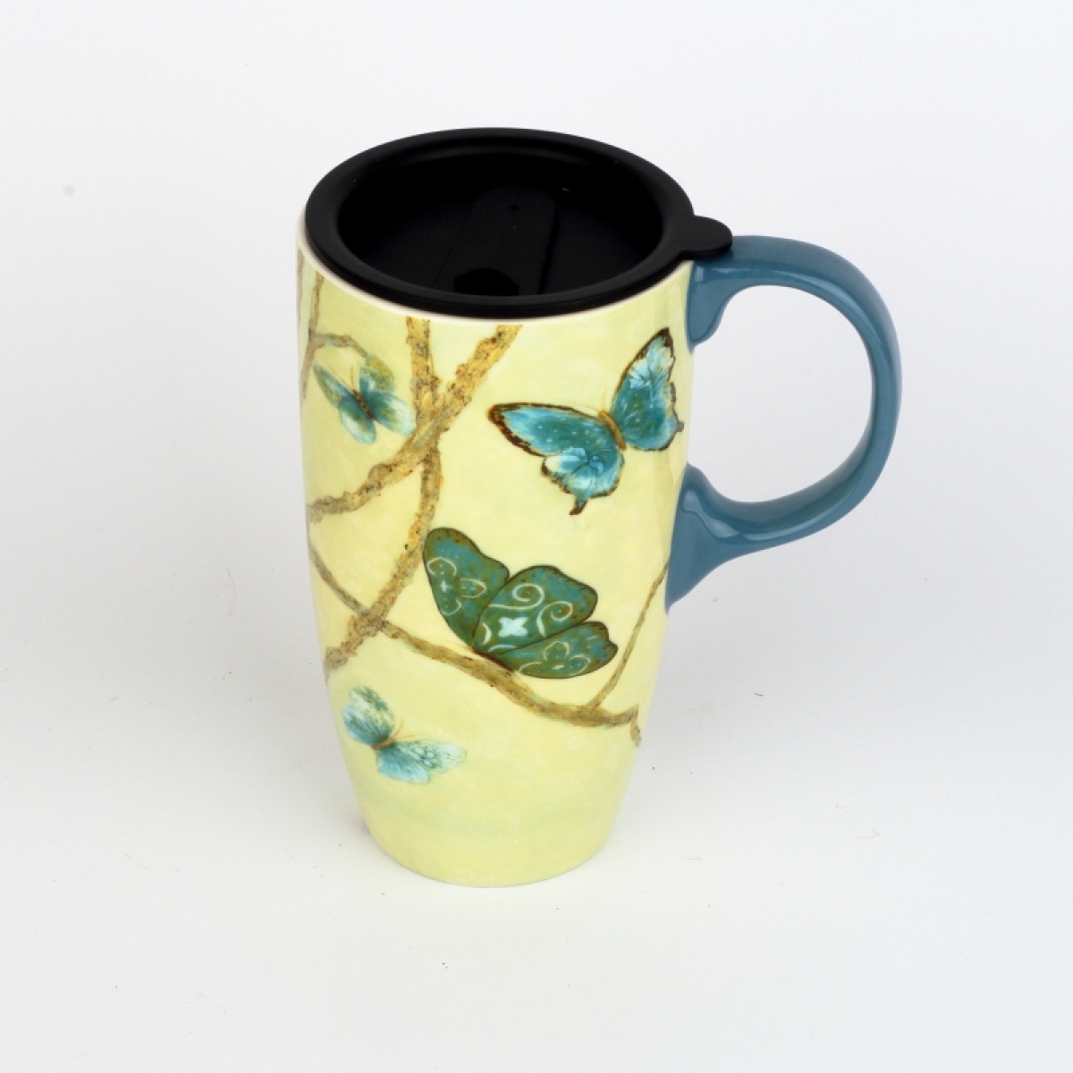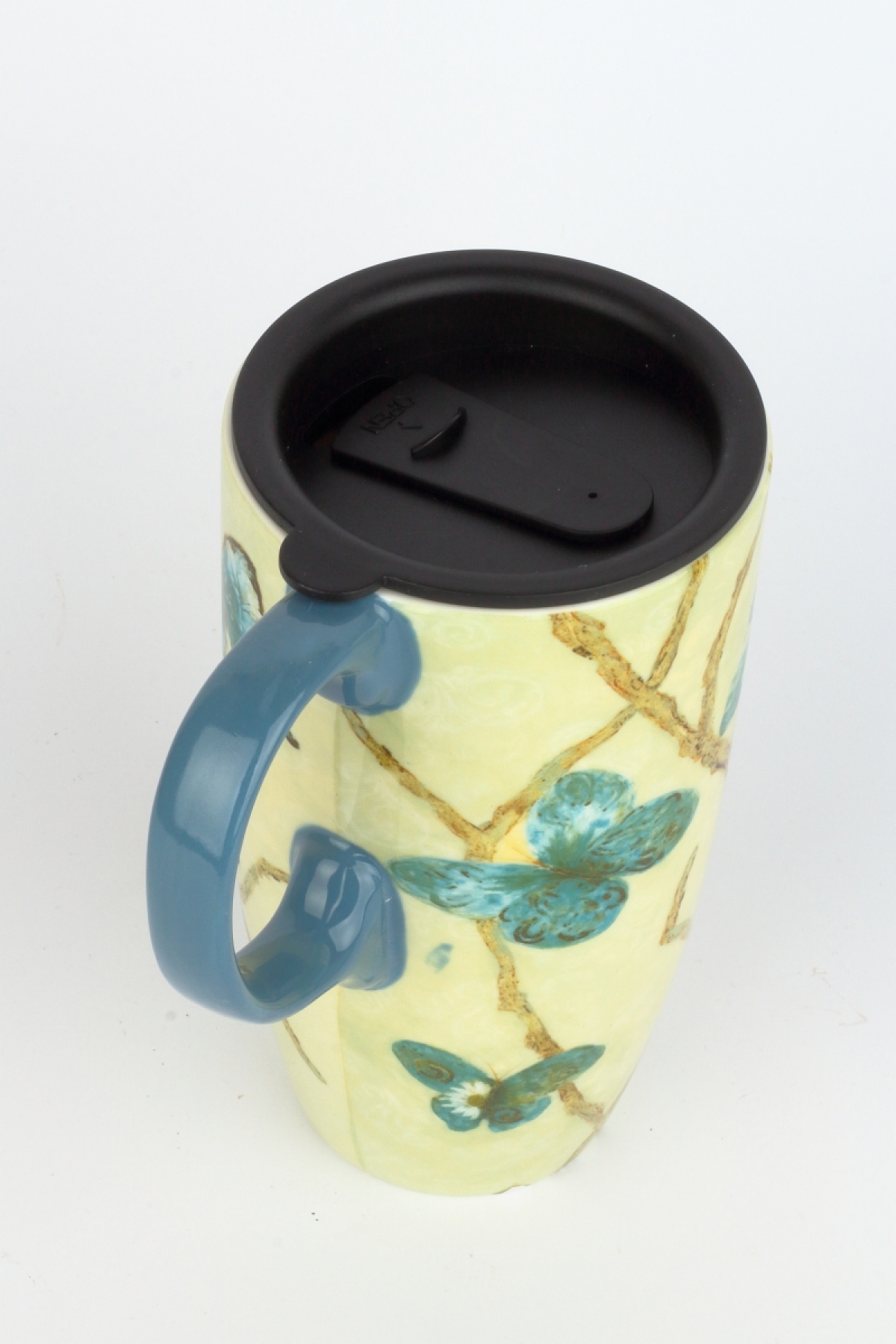 Cestovní hrnek na kávu nebo čaj s barevným potiskem motýlů.