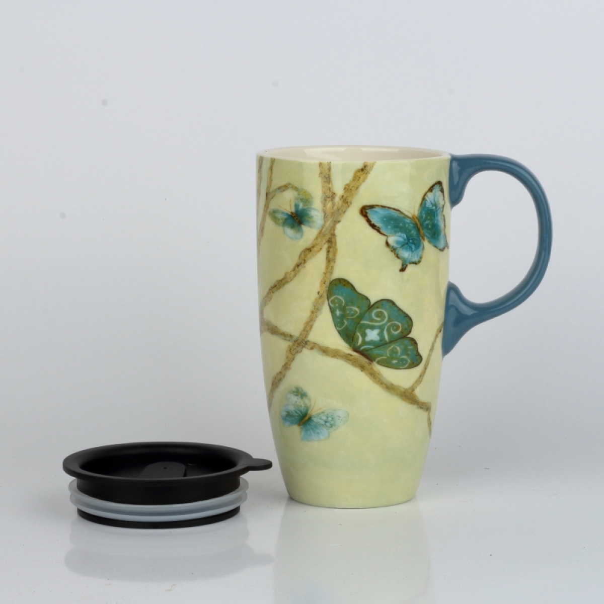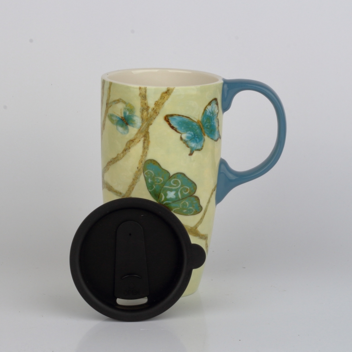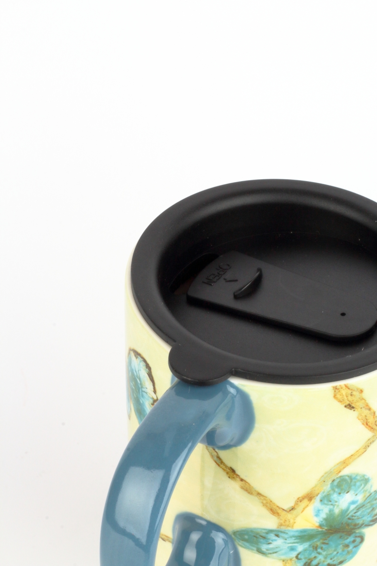 Cestovní hrnek na kávu nebo čaj s barevným potiskem motýlů.