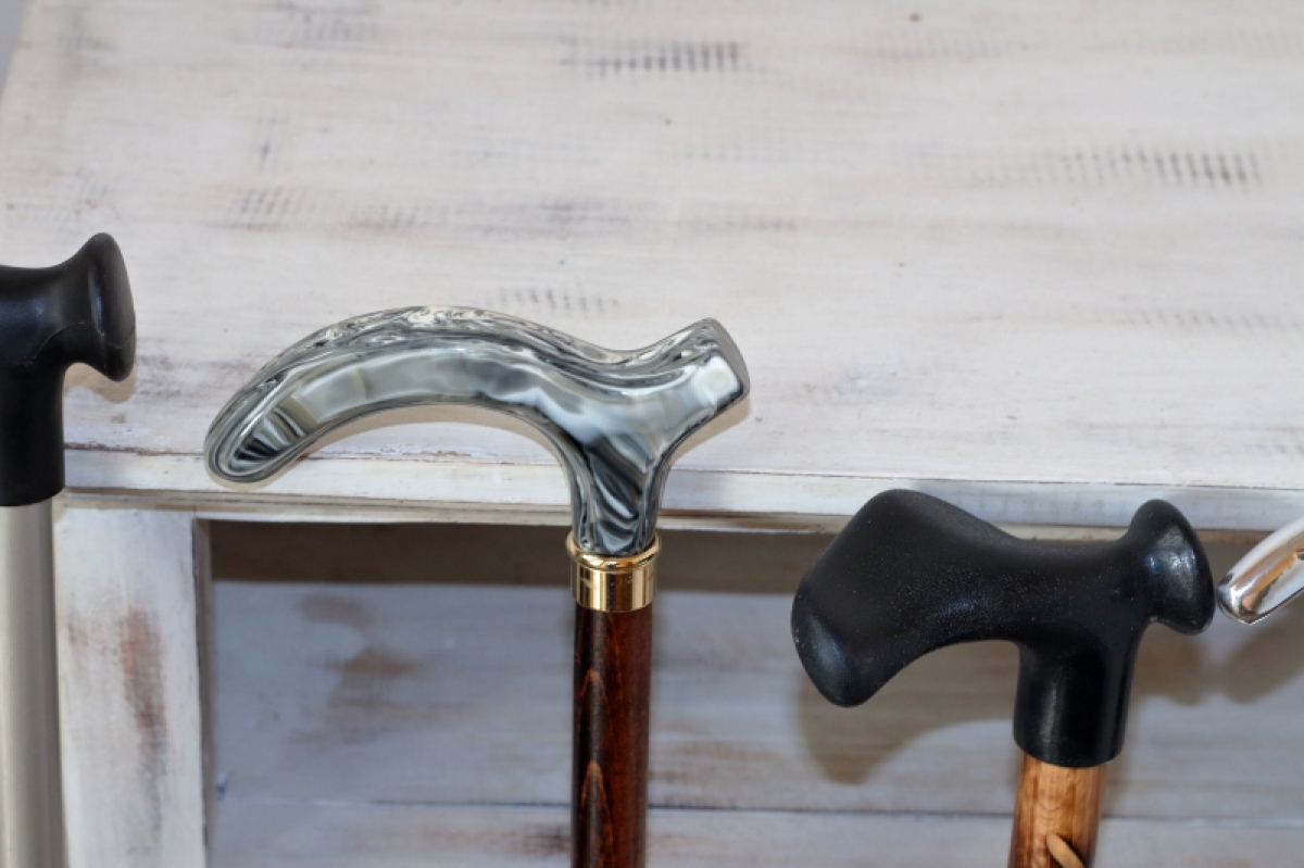 Plně funkční dámské vycházková hole z masivního, tmavě hnědého dřeva s elegantní mramorově žíhanou rukojetí černobílé barvy, umožňující pevné opření ruky.