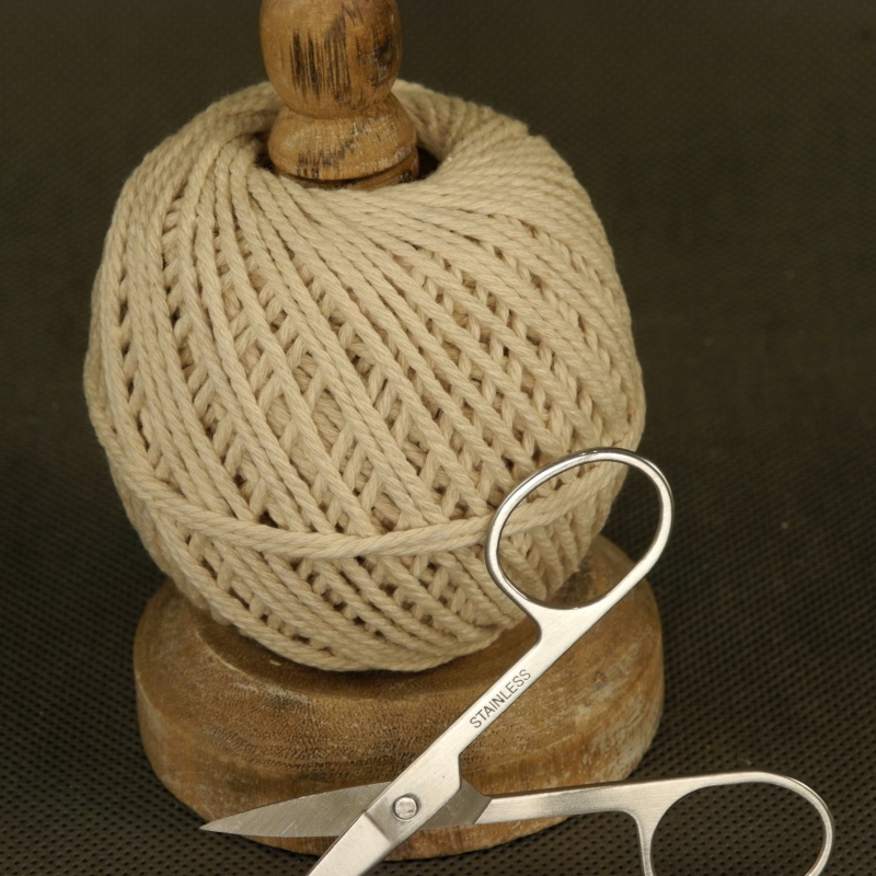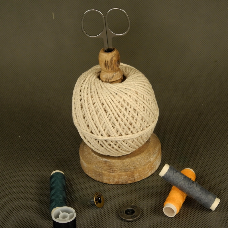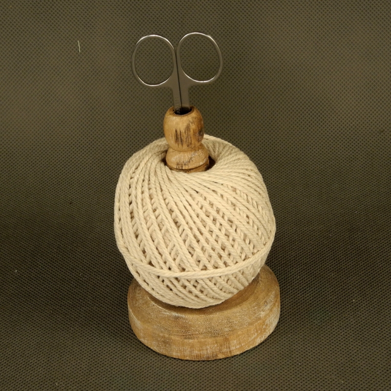 Dárkové balení obsahuje klubíčko, ručně vyráběný dřevěný stojánek a nůžky.