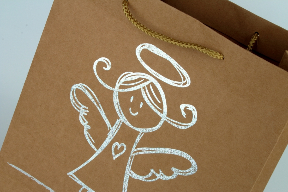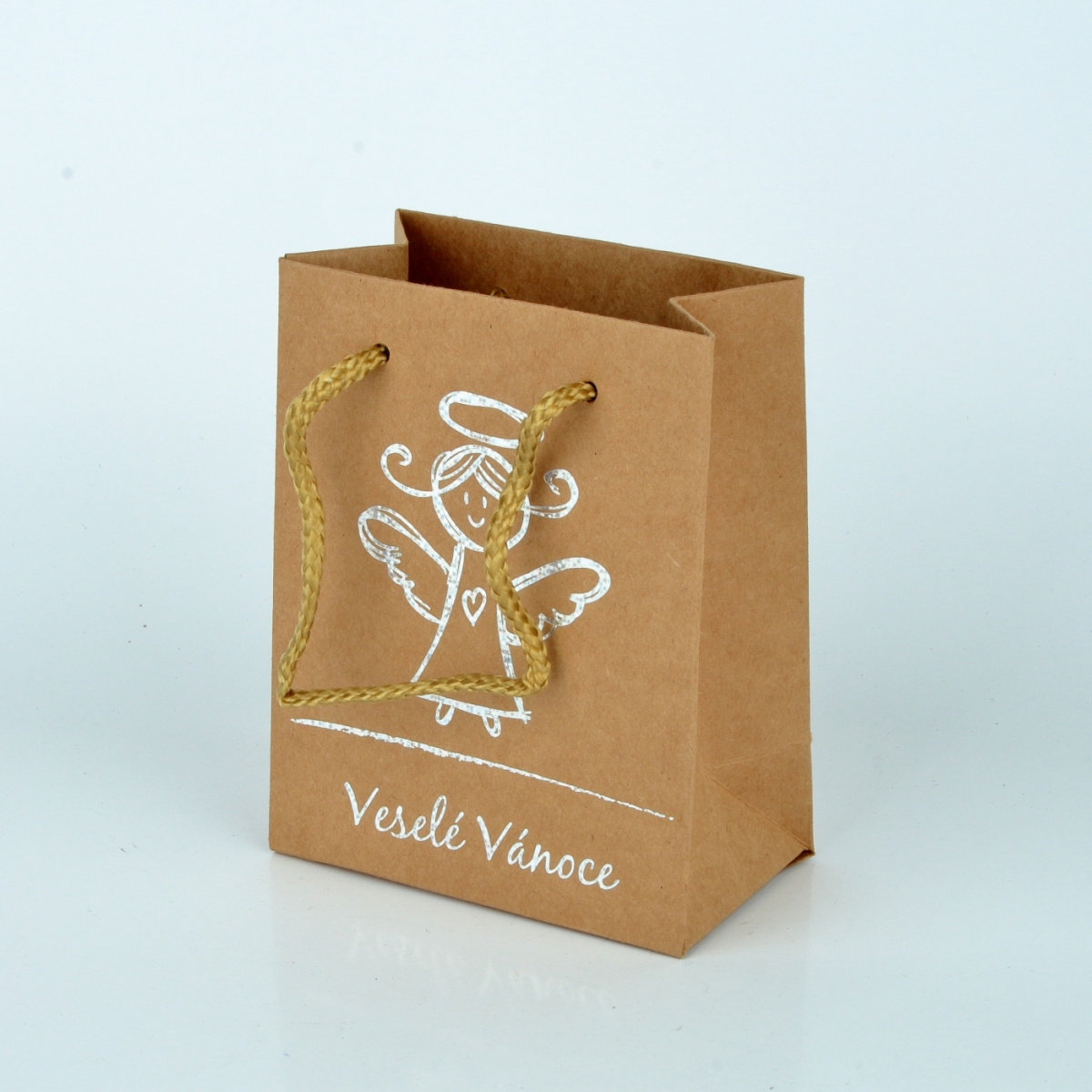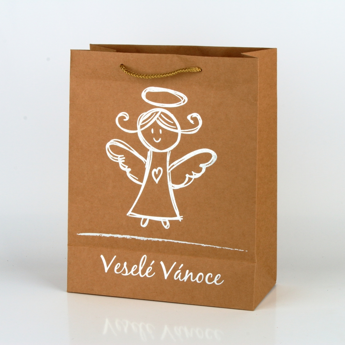 Dárková taška z papíru s andělem a nápisem Veselé Vánoce - střední