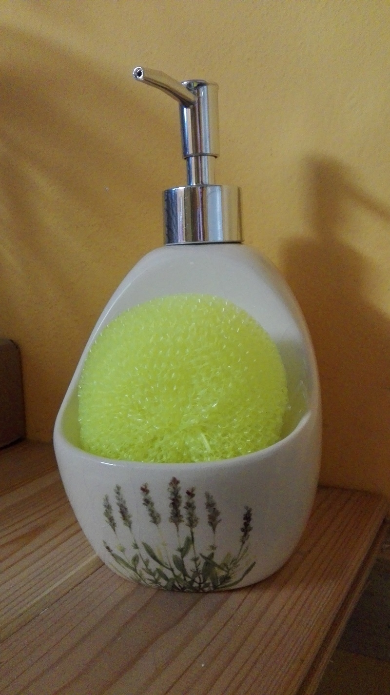 Velmi praktický kuchyňský set dávkovače mýdla na nádobí včetně prostoru na dokládání drátěnky či houbičky.