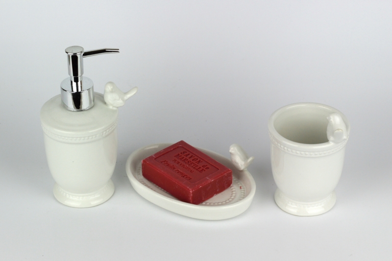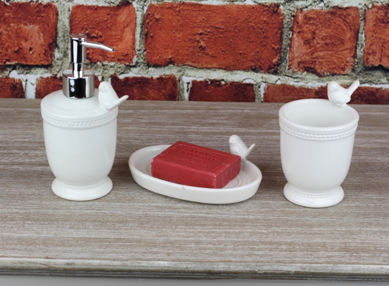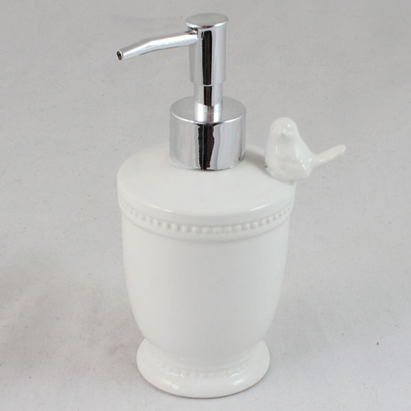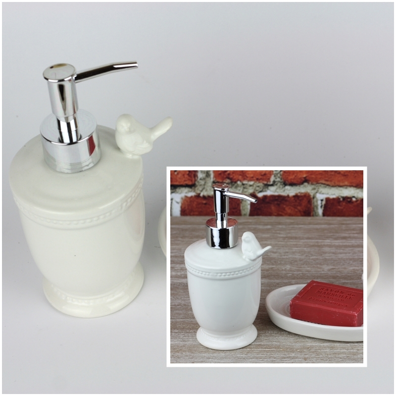 Dávkovač na tekuté mýdlo patří do koupelnového setu z bílé keramiky s ptáčkem.