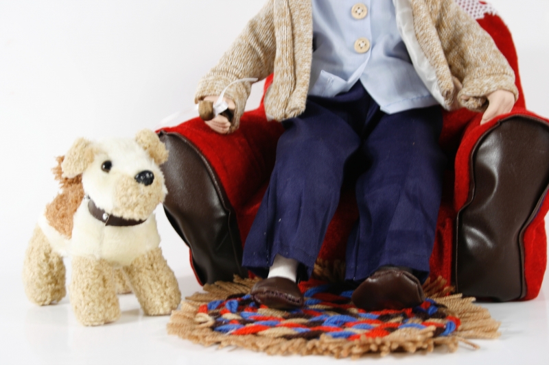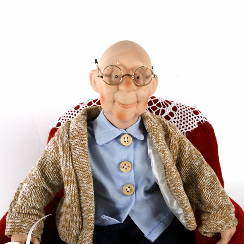 Dědeček v křesle 32cm na obrázku není jen tak obyčejná panenka. Vlastně to není žádná panenka, ale důstojný starý dědeček. Odpočívá v křesle, celková výška jeho postavy je 40 cm, křeslo je vysoké 24 cm, široké 32 cm a hluboké 16 cm.