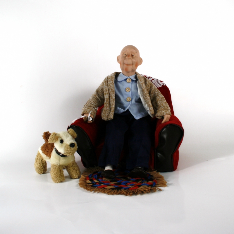 Dědeček má oči chráněné kulatými stříbrnými brýlemi, hřeje ho vlněný svetr hnědé barvy zapínací na veliké knoflíky. Pod nohama leží malý kulatý kobereček a na opěradle křesla se vyjímá háčkovaný přehoz.