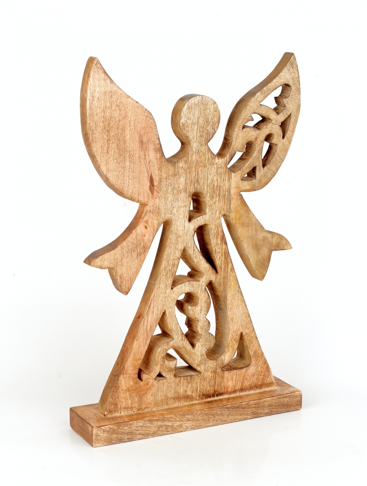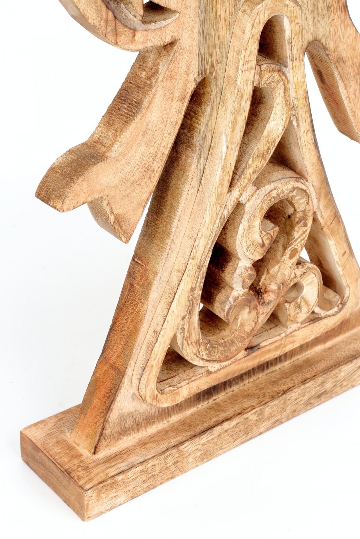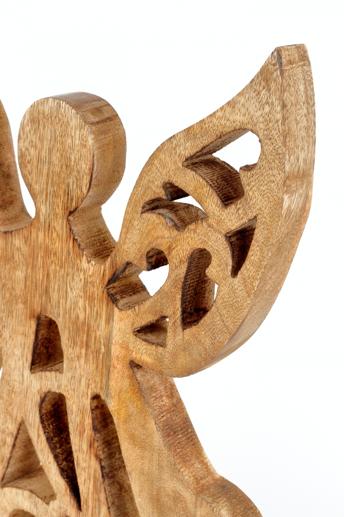 Dekorace do bytu vyřezávaný anděl je vyrobený z mangového dřeva. Jeho siluety nepůsobí charakteristicky vánočně. Proto může v interiéru sloužit celoročně.