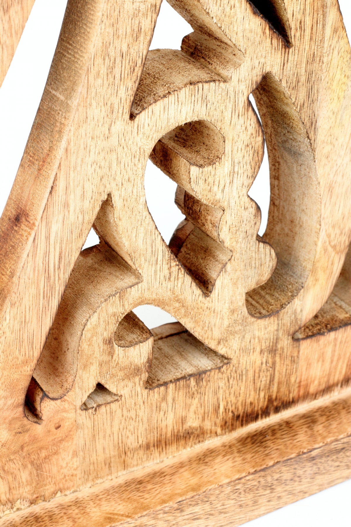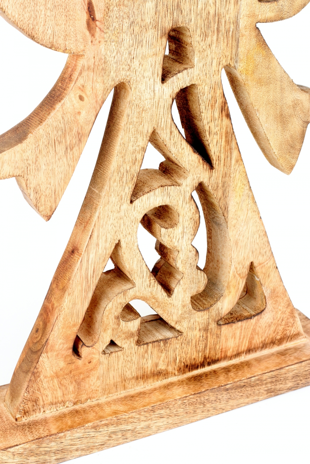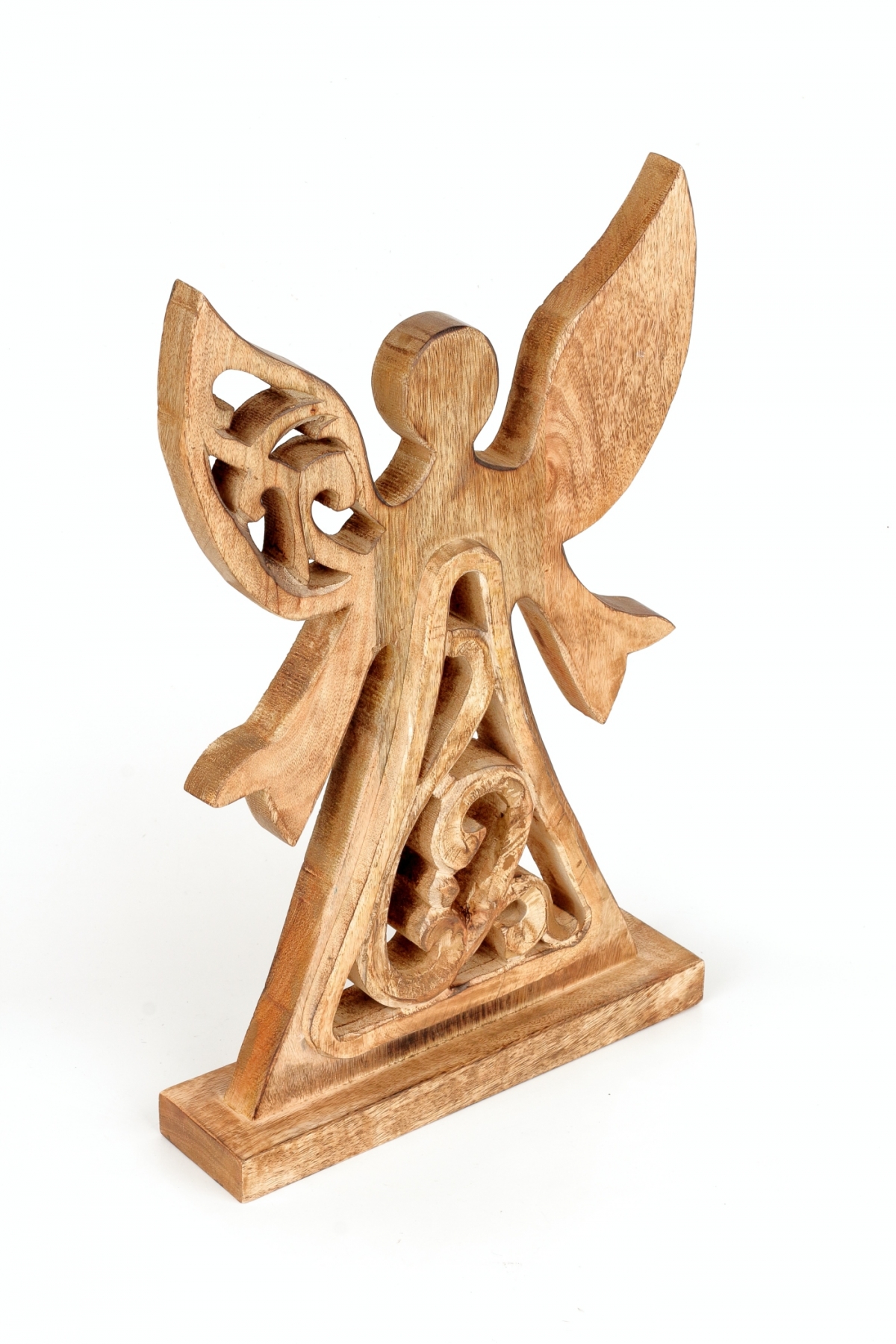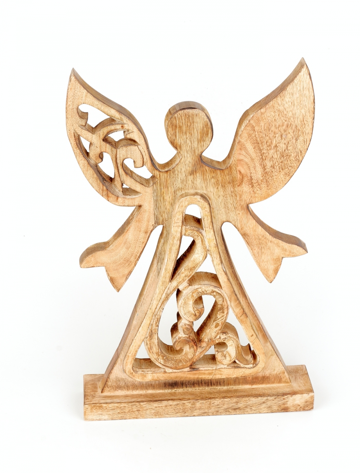 Dekorace do bytu vyřezávaný anděl je vyrobený z mangového dřeva. Jeho siluety nepůsobí charakteristicky vánočně. Proto může v interiéru sloužit celoročně.