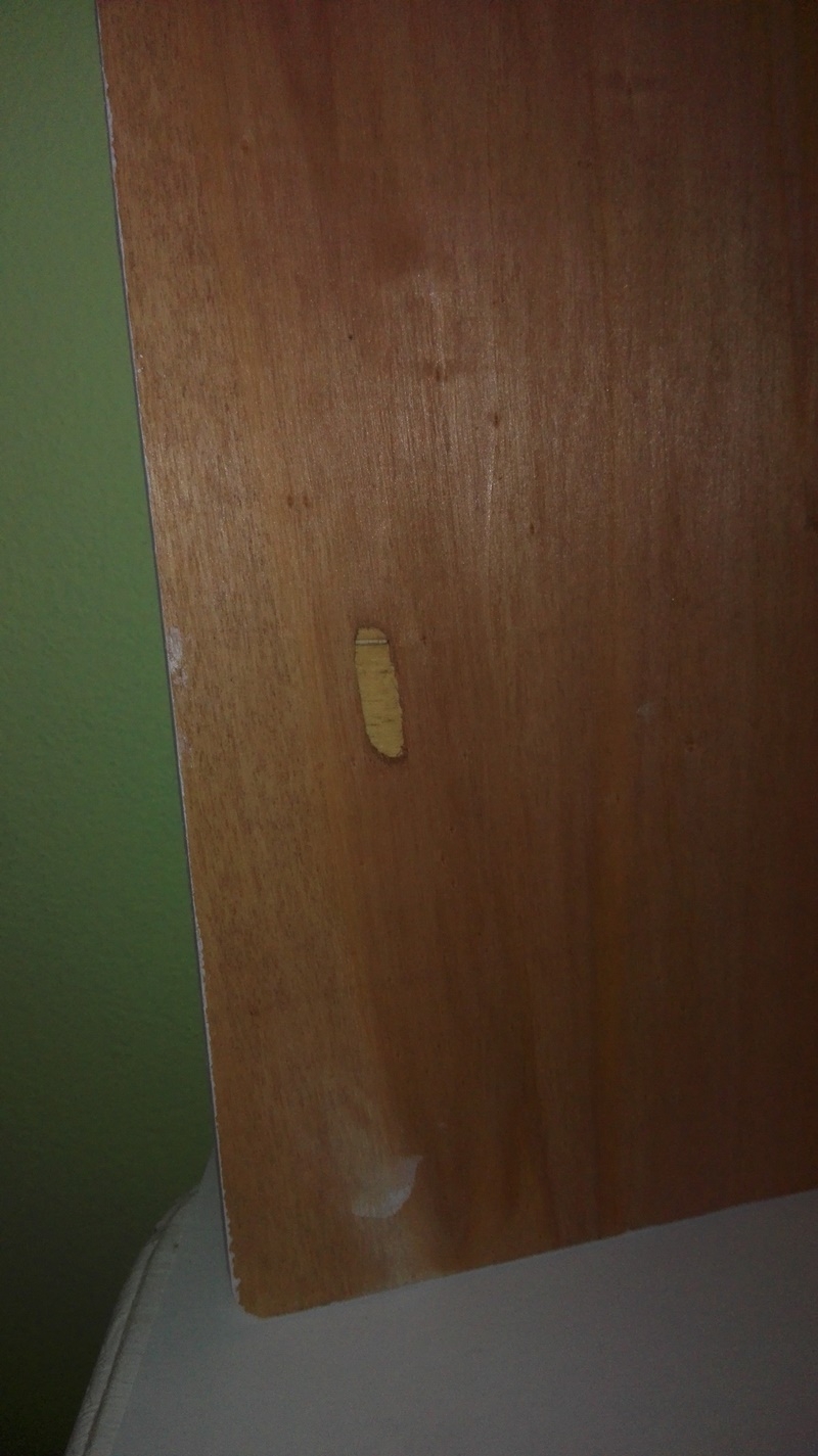 Vyřazeno z důvodu odštíplého kousku dřeva ( 1,5 cm) ze zadní strany prkénka viz. obr. č. 5.
