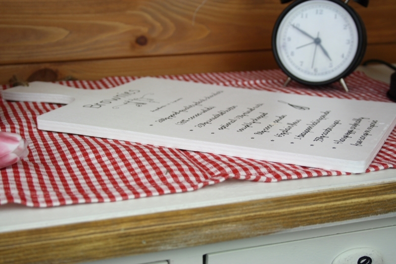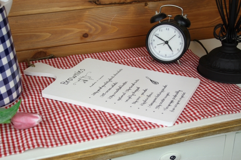 Dekorační prkénko nám sděluje recept na lahodné brownies. Prkénko slouží pouze jako stylová dekorace, ale recept můžete klidně vyzkoušet. V nabídce naleznete ještě jedno prkénko s receptem na brownies.