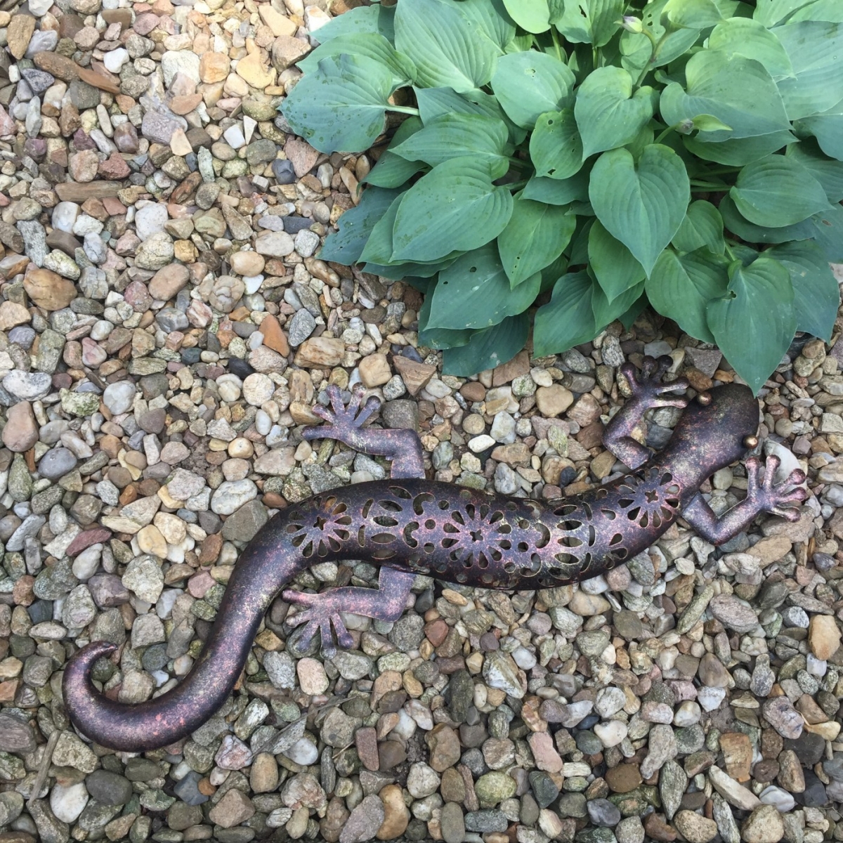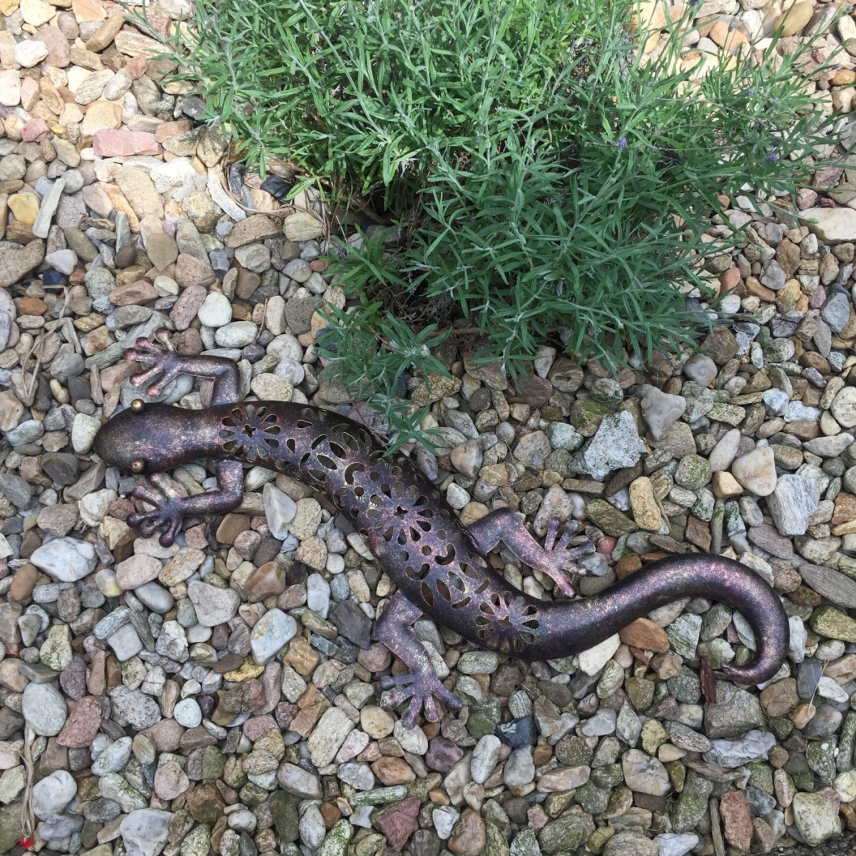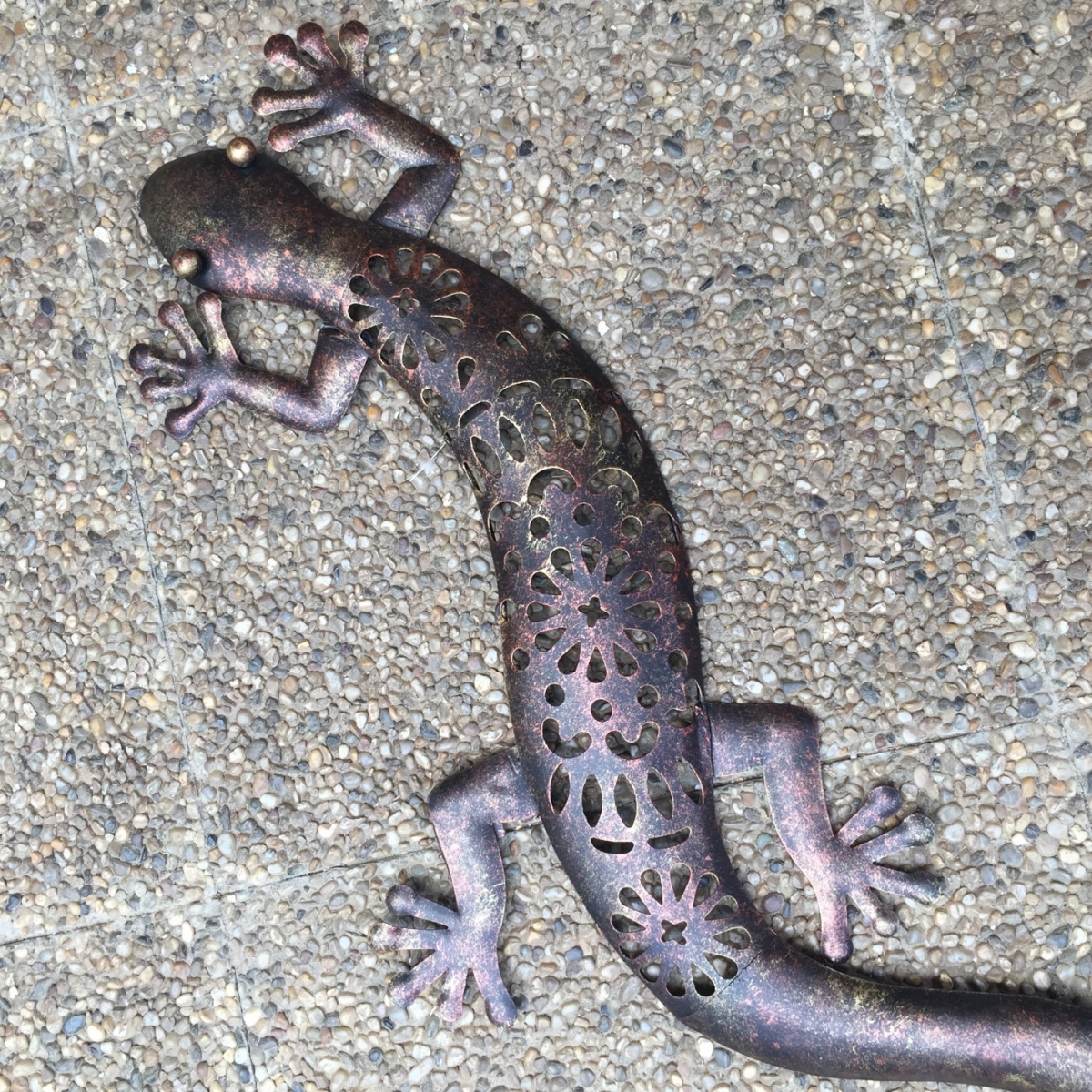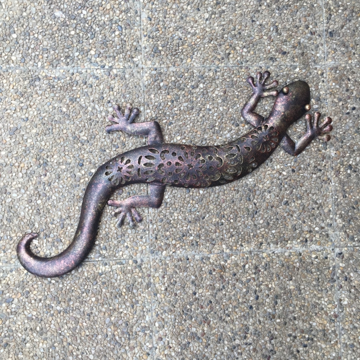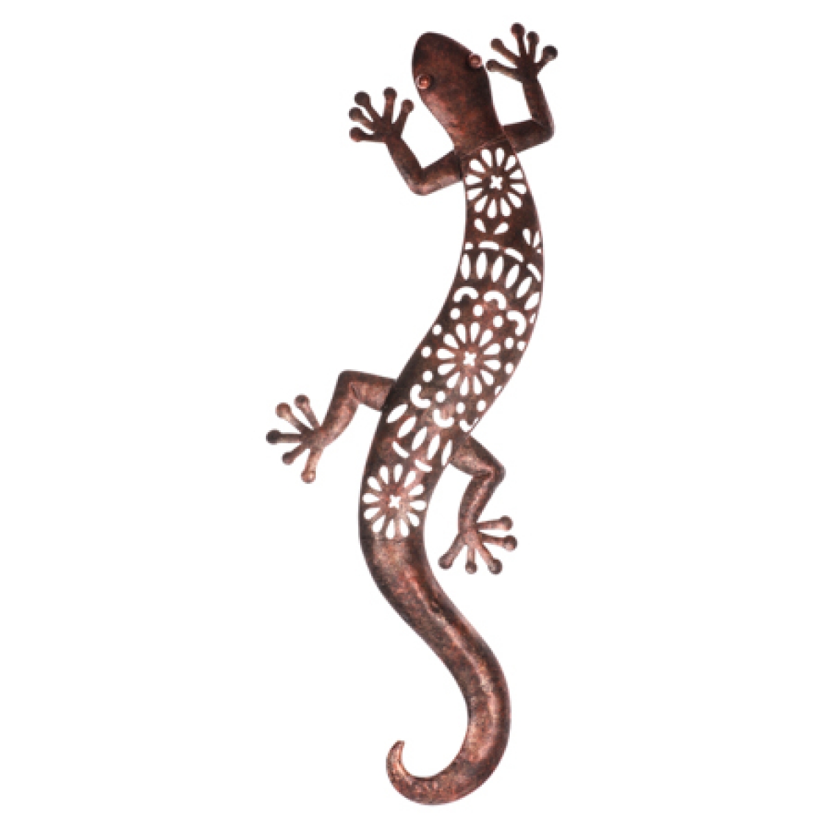 Dekorace do pergoly v podobě kovové ještěrky s ozdobně perforovaným tělem a zajímavé kombinaci hnědé, zlaté a měděné barvy, oživí jak váš interiér tak i exteriér.