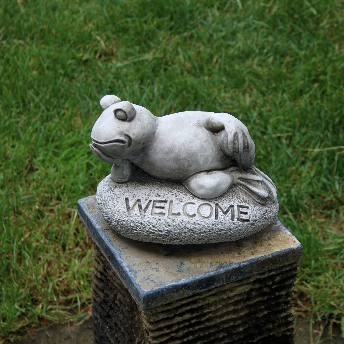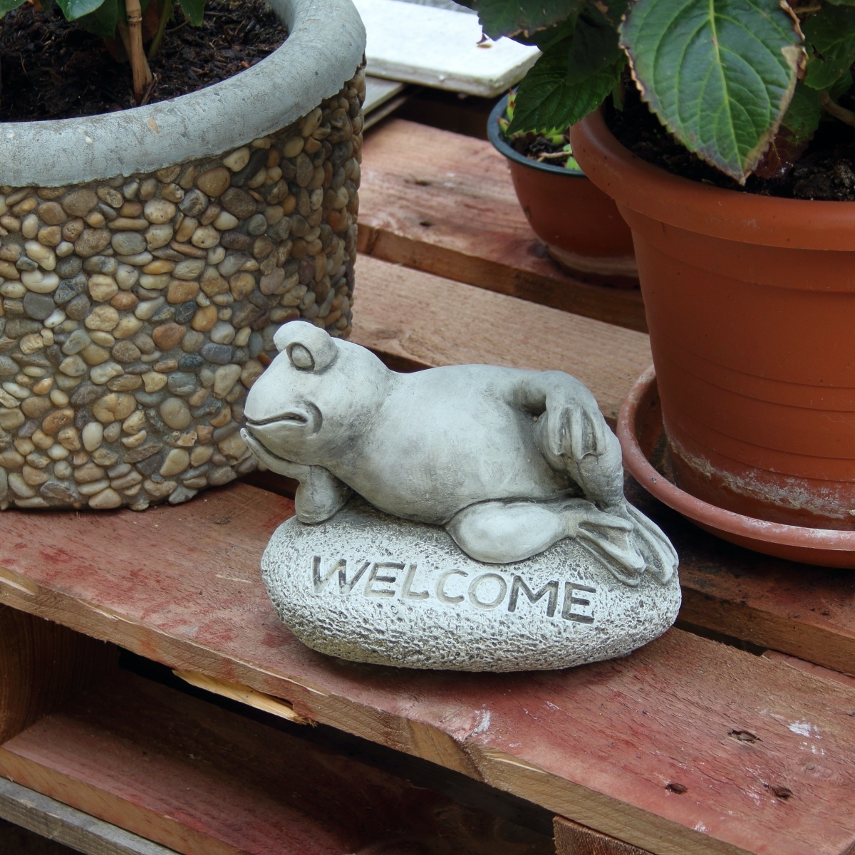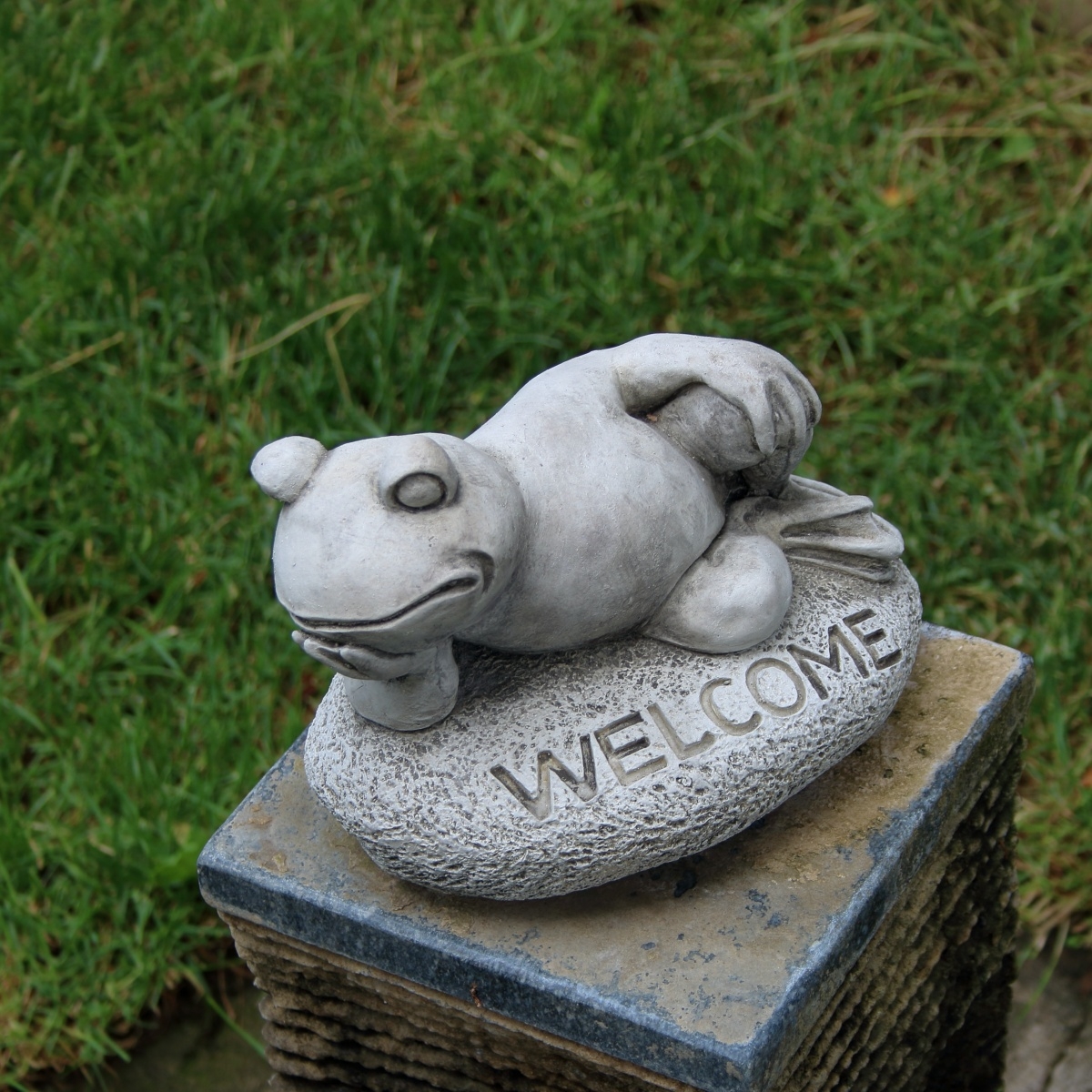 Dekorace k jezírku v podobě žáby na kameni s nápisem WELCOME (Vítejte)