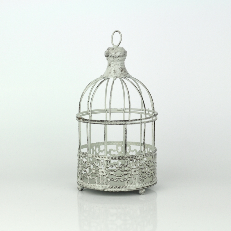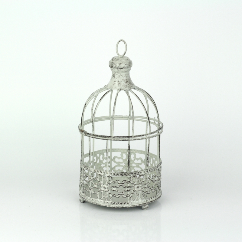 Kovová klec v bílé barvě s patinou má odklopné víko, klec lze také zavěsit za kovový kroužek v horní části.