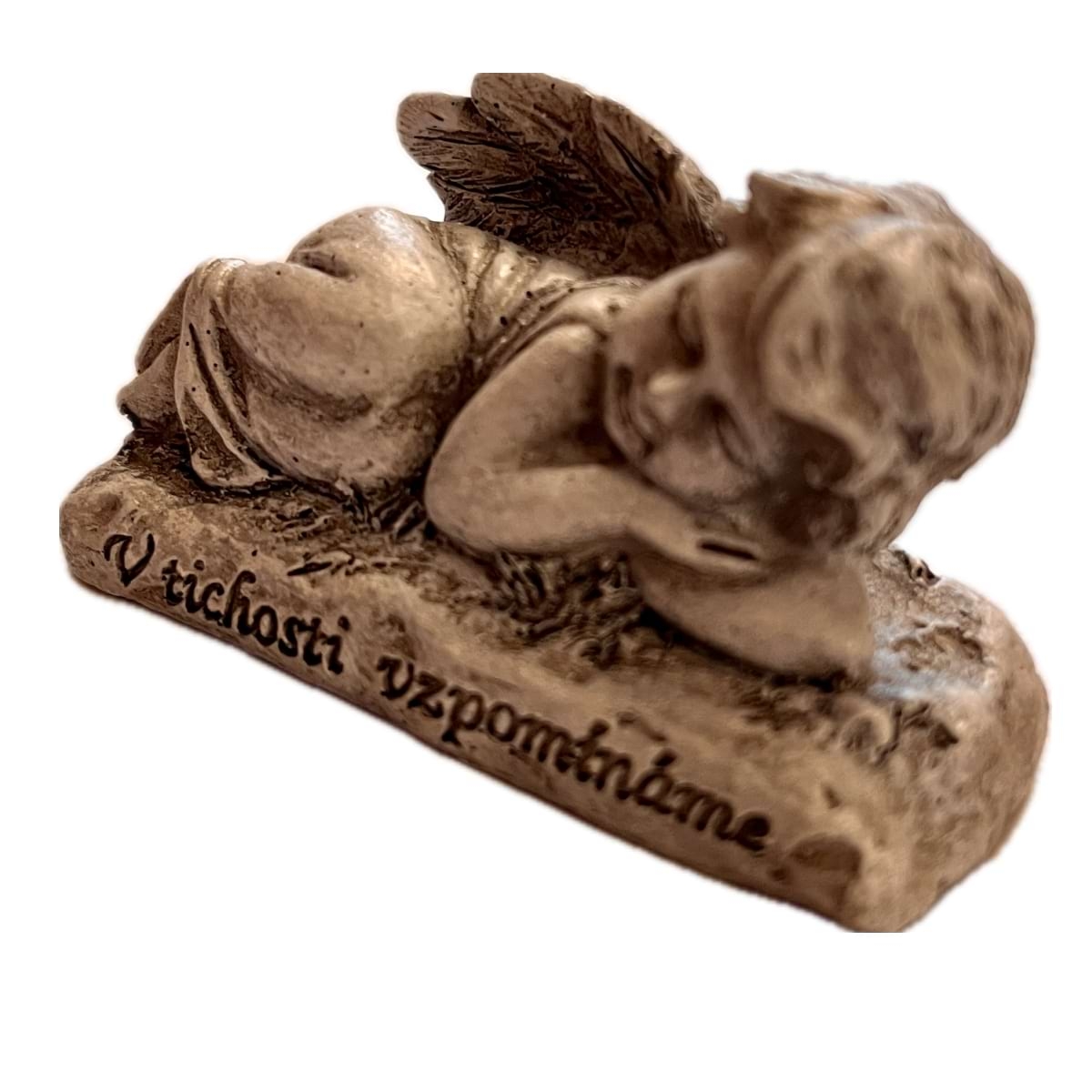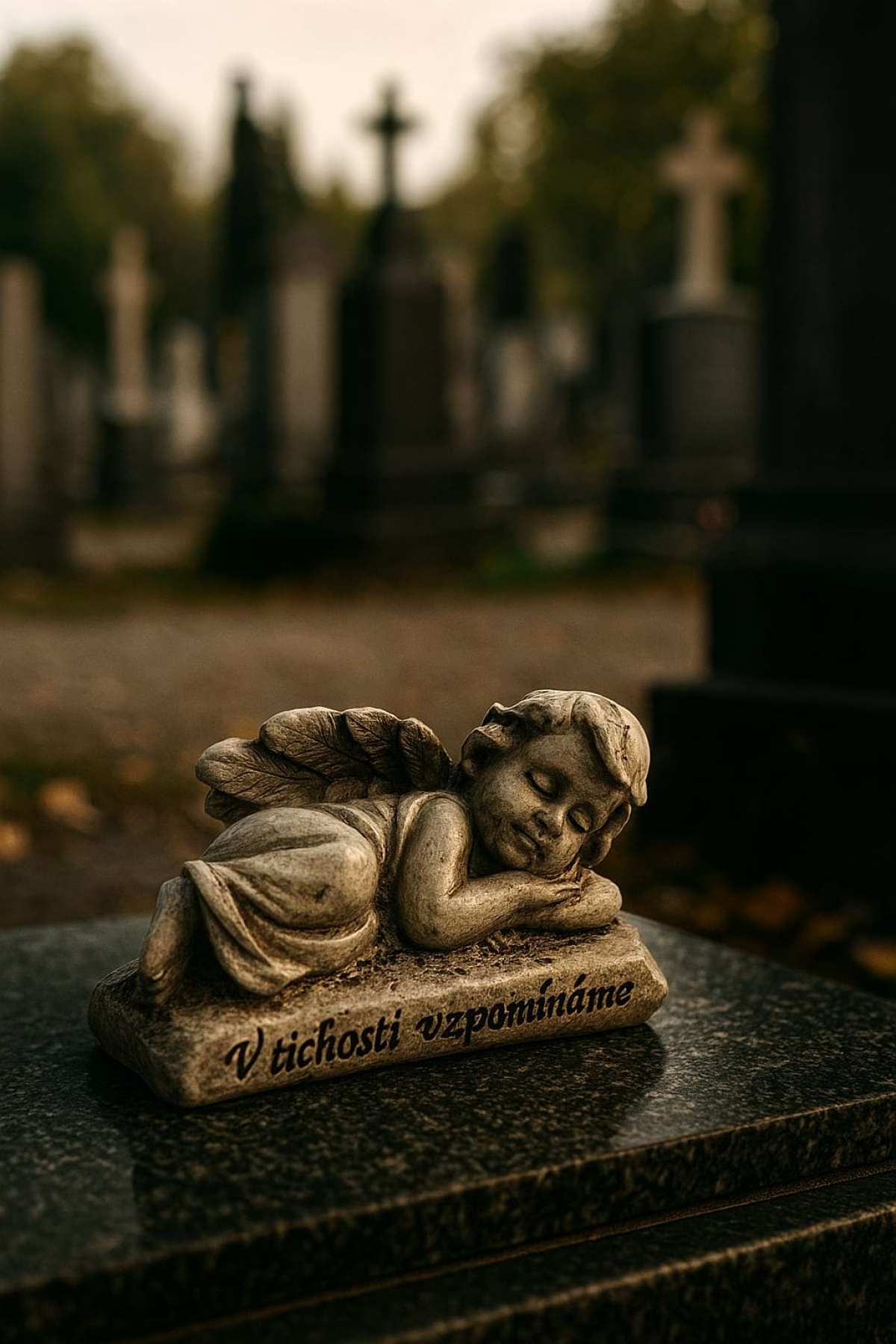 - Emoční síla minimalismu — skloněné křídla i tvar těla anděla působí pokorně; nápis zdůrazňuje klid a vzpomínku.