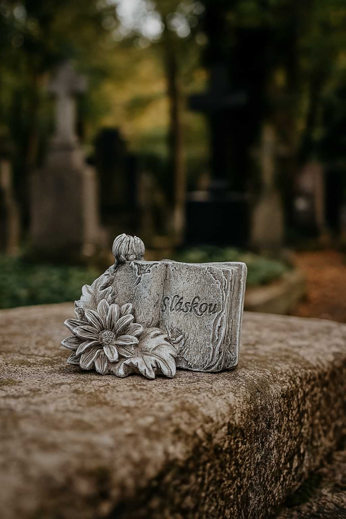 Tato malá kniha je víc než dekorace — je to osobní dopis v tichu. Otevřené stránky zdobí jemná květina, titulní deska nese něžný nápis S Láskou. Velikost 5 × 7 × 4 cm ji předurčuje k tomu, aby našla místo u fotografie, v kolumbáriu nebo přímo na hrobě — srdce-teď-tady, i když duše odešla.