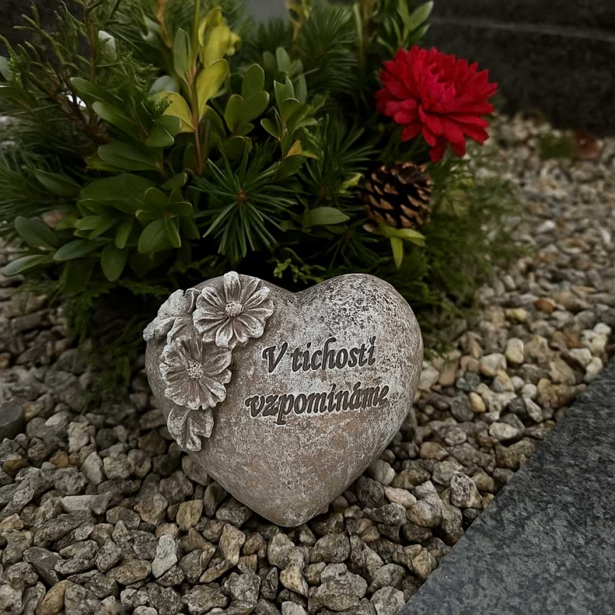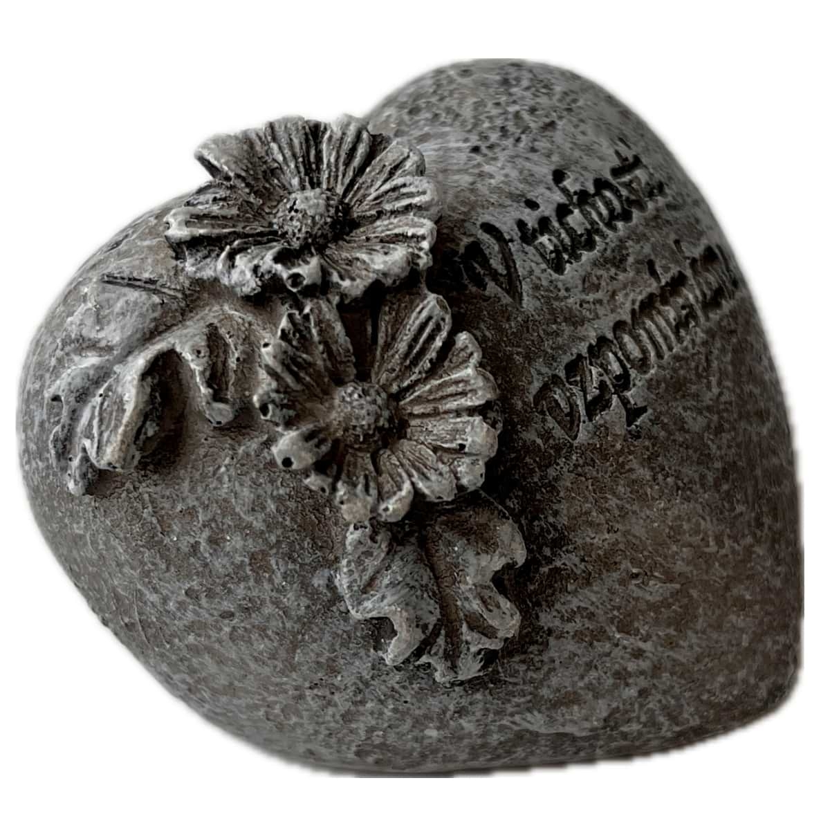 Toto drobné, ale významné srdce je více než dekorace — je to něžný pozdrav, projev lásky, který přečká čas. Vyřezávaný nápis „V tichosti vzpomínáme“ dodává každému místu, kde je umístěno — u fotky, v kolumbáriu nebo na náhrobku — klidný pocit útěchy a úcty. Jemný tvar, měkké linie a decentní rozměry 5 × 6,5 × 5,5 cm zaručují, že srdce působí jako intimní symbol, nikoli rušivý prvek.