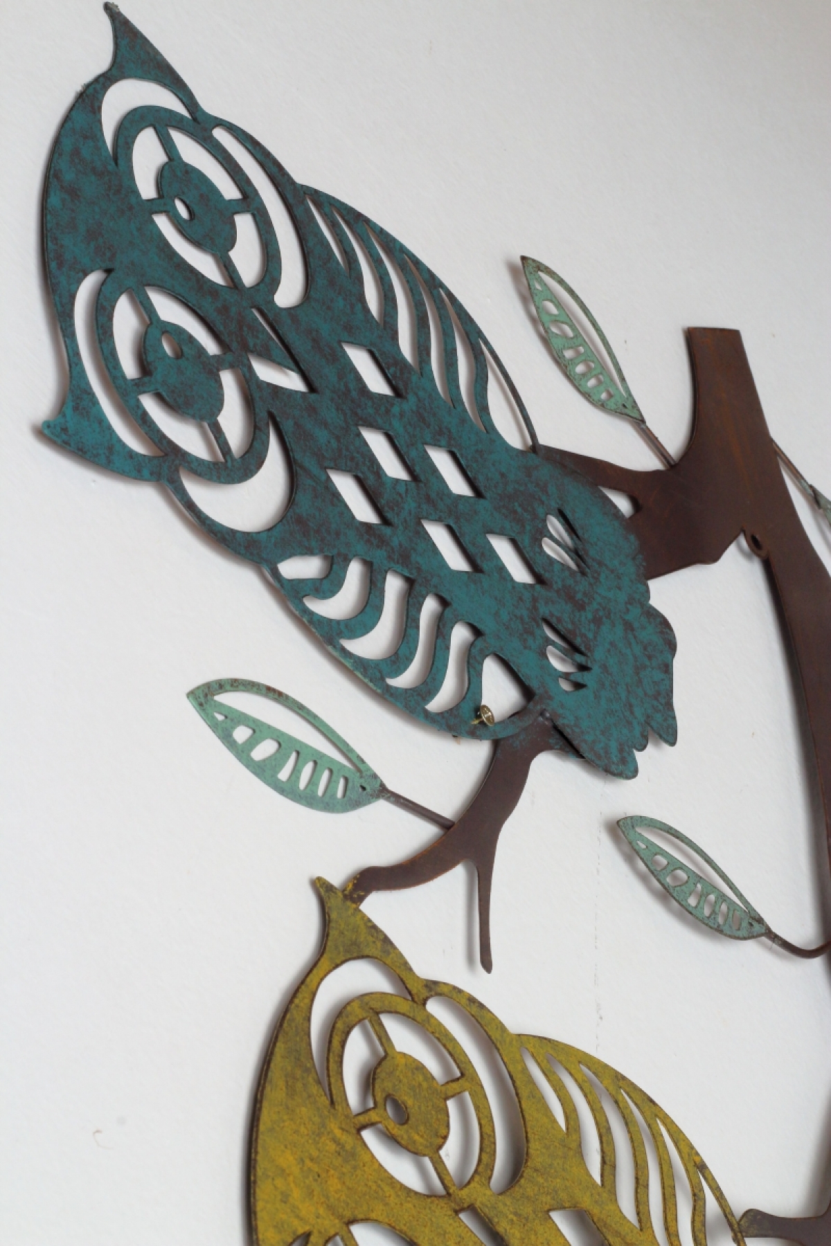 Dekorace na zeď sovy 69x54cm oživí každou stěnu. Kovové sovy sedí na větvi stromu, jsou symbolem moudrosti a rozvahy. Větev navíc zdobí drobné lístky.